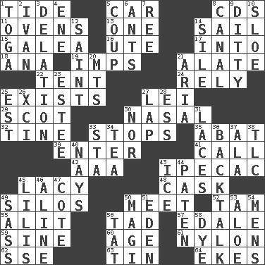 ACROSS 1. Event that recurs at intervals 5. Auto 8. Music discs 11. Baking chambers 13. Single 14. Move on water 15. An organ shaped like a helmet 16. Shoshoni 17. To the inside or interior of 18. Santa ___, CA 19. Naughty children 21. Having winglike extensions 22. Portable shelter 24. Have confidence or faith in 25. Is extant 27. Luau accessory 29. Highlander 30. Relating to the nose 32. Prong on a fork 33. Halts 35. Blind as ____ 39. Keyboard key 41. Give a ring to 42. American Automobile Association (abbr.) 43. Medicinal drug used to evoke vomiting 45. Made of lace 48. Keg 49. Grain storage towers 50. Rendezvous 52. Scottish cap 55. Set down 56. Small amount or degree 57. Peak District village in England 59. Trig term 60. Ripen 61. High-strength synthetic material 62. Compass dir. 63. Metal container 64. Makes supply last DOWN 1. Ancient Roman robe 2. "Terrible" tsar 3. Accusation by an informer 4. Compass dir. 5. Clever action or accomplishment 6. Pismires 7. To separate or throw off 8. Lessep's creation 9. Short, simple song 10. _ gin 12. Inhabitant of Heaven 14. Filth; sediment 20. Mountains (abbr.) 21. Roberta Peters solo 23. First name in cosmetics 25. Eastern Standard Time (abbr.) 26. One more than ninety 27. Pet locale 28. Curvy letter 30. And not 31. Shoestrings 33. R.R. building 34. Afternoon social gathering 36. Sass 37. Wing 38. Affectionate concern, for short 40. Negative votes 43. Frozen water 44. Eucharist need 45. Ms. Damita and namesakes 46. Place in a line 47. ____ d'Azur (French Riviera) 49. Backtalk 50. Wise men 51. Paradise 53. Medicinal plant 54. Not women's 56. Make lace 58. Color