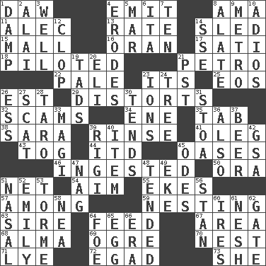 ACROSS 1. Obsolete 4. Give off 8. Housemaid (var.) 11. Actor Baldwin 13. Assign a rank or rating to 14. Downhill vehicle 15. Promenade 16. Northwest Algerian city 17. Suttee (variant) 18. Manned the helm 21. Stone: prefix 22. Light colored 23. It is 25. Greek goddess of the dawn 26. Eastern Standard Time (abbr.) 29. What propaganda does 32. Fraudulent business schemes 34. Compass dir. 35. Keyboard key 38. "Two Mules for Sister ____" 39. Wash lightly 41. Cassini of fashion 43. Coat; cloak 44. It would 45. Fertile tracts in a desert 46. Eaten 50. Mouth or opening 51. Fish or hair follower 54. Direct toward a target or goal 55. Makes supply last 57. Amid 59. Snuggling 63. Father 64. Nourish 67. Type of rug 68. _ mater 69. Legendary monster 70. A home for chicks 71. Potassium hydroxide 72. Mild oath 73. A female animal or person DOWN 1. Moist 2. Jai _ 3. Water source 4. Eats (away) 5. Third mo. 6. Call ___ day 7. Nine, plus one 8. Having winglike extensions 9. Paris' subway 10. Goodbye (Sp.) 12. Hoof sound 14. Compass dir. 19. Small amounts or degrees 20. Biblical high priest 21. Pacific Standard Time (abbr.) 23. Charged particles 24. Family _ (genealogy) 26. Curvy letter 27. Scram! 28. Pacific island yam 30. Is inclined (to) 31. Portico 33. Wise men 36. In addition 37. Fermented drink made from hops 39. Swiss mountan, "Queen of the Mountains" 40. Detail 42. Girls' org. (abbr.) 45. Lyric poems 47. Tired old horse 48. Looked after 49. Supplement with great effort 51. Relating to the nose 52. Poet Dickinson 53. Singer Mel 56. Comedian Laurel of Laurel & Hardy 58. Teachers' org. 60. Angers 61. Delicate 62. Yard entry 64. Enemy 65. Ovum 66. Period