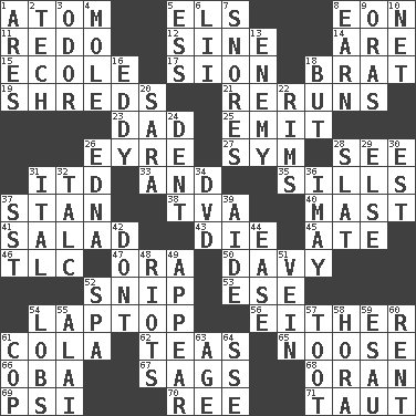 ACROSS 1. Smallest unit of an element 5. Raised railways 8. A really long time 11. Redecorate 12. Trig term 14. "We ___ not amused" (Victoria) 15. Learning spot: Fr. 17. The Jewish people; Israel 18. Naughty child 19. Fragments 21. Summer TV shows 23. June honoree 25. Send forth 26. Jane of fiction 27. Symbol (abbr.) 28. Perceive with the eye 31. It would 33. Plus 35. Beverly of Met fame 37. Comedian Laurel of Laurel & Hardy 38. Federal power corp. 40. Vertical spar for supporting sails 41. First course 43. Expire 45. Had dinner 46. Affectionate concern, for short 47. Mouth or opening 50. American folk hero Crockett 52. Clip 53. Compass dir. 54. Portable computer 56. One or the other 61. Root beer relative 62. Afternoon social gatherings 65. Trap for birds or small mammals 66. Chief or king in Benin or Nigeria 67. Settles 68. NW Algerian seaport 69. Air pressure measure (abbr.) 70. To separate or throw off 71. Pulled tight DOWN 1. Ancient Greek god of war 2. Technical 3. Scent 4. Undercover agent 5. Curvy letter 6. Cards in a Roman deck? 7. Sounds asleep 8. Merit 9. Mouths or openings 10. Fish or hair follower 13. Foe 16. Whirlpool 18. On the contrary 20. "Two Mules for Sister ____" 22. Basketball hoops 24. Gouge 26. Pulitzer Prize-winning author Ferber 28. Narrow board 29. Otherwise 30. Eastern Standard Time (abbr.) 31. Slanted text style (abbr.) 32. Baby powder 34. Movie disc 36. "If ____ say so..." 37. Fast jet (abbr.) 39. Helper 42. Do not 44. Relaxation 48. Disturbances 49. Become visible 51. Distinctive style or manner 52. Health resort 54. Tennis shots 55. Jai ____ 57. A blast of a horn 58. Israeli folk dance 59. He sold his birthright 60. Monthly bill 61. Police officer (slang) 63. Ripen 64. Compass dir.