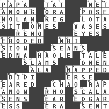 ACROSS 1. Dad 5. Make lace 8. Remaining after all deductions 11. Amid 13. Mouth or opening 14. Airs 15. Pitcher Ryan 16. Barrel 17. Globular water bottle used in Asia 18. Be seated 19. Washington bills 21. Flower holders 22. San ____ (Riviera town) 24. Snake ____ (dice throw) 25. Worn away 27. Medical imaging device (abbr.) 29. The Jewish people; Israel 30. Seines 32. Pulitzer Prize-winning author Ferber 33. White Person, in Hawaii 35. Story 39. Criticizes harshly 41. Sign of things to come 42. Insect wing 43. Slept 45. "You Light Up My Life" star Conn 48. Celtic language 49. Having ears or earlike features 50. US Secretary of Labor Elaine L. _ 52. Strike 55. At once, immediately (arch.) 56. 17th letter of the Greek alphabet 57. Any of the three canals of the cochlea 59. Elected reps. 60. Hearing organ 61. _ Allan Poe 62. Double-curved letter 63. Epoch 64. Posted DOWN 1. Baking dishes 2. Mine, in Marseilles 3. Coward 4. Santa ___, CA 5. Casino tip 6. Ancient Greek god of war 7. Label 8. Trap for birds or small mammals 9. _____ Park, CO 10. Afternoon social gatherings 12. Dwarf 14. Frolic 20. Allow head to fall sleepily 21. Distinctive style or manner 23. Ferber et al. 25. Compass dir. 26. To free from 27. Cartoonist voice _ Blanc 28. Actress Charlotte 30. Mayday 31. Ceases 33. Actor Linden 34. Housemaid (var.) 36. Electrical Measurement 37. Area sheltered from the wind 38. Conclude 40. Put down 43. Teachers' org. 44. Came up 45. Natives or inhabitants of Denmark 46. Removes the wrinkles 47. Lairs 49. Relaxation 50. Burn to charcoal 51. Israeli folk dance 53. Actor Alda or Thicke 54. Component 56. To sift 58. Music discs