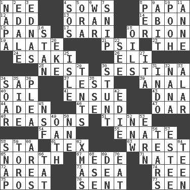 ACROSS 1. Born 4. Sty mamas 8. Dad 12. Increase 13. NW Algerian seaport 14. Inky black, to poets 15. Zero-star reviews 17. Indian skirt 18. Constellation of myth 19. Having winglike extensions 21. Air pressure measure (abbr.) 23. Definite Article 24. 1973 Nobel Price Winner (Physics) Leo 26. Biblical high priest 28. Egg locale 30. French poetic form 34. Plant excrement 37. For fear that 39. Of or related to the anus 40. Petroleum 41. Follow as a consequence or result 43. Heredity factor (abbr.) 44. An important port of Yemen 46. Be inclined (to) 47. Rowing implement 48. Thinks logically 51. Prong on a fork 54. Avid follower 55. Maternal 58. R.R. building 61. John Ritter's dad 63. Obtain by seizing forcibly or violently 65. 0 degrees 67. Ancient Persian 71. Nathan's nickname 72. Length times width 73. Toward the sea 74. To separate or throw off 75. Mail 76. Emitted 77. Elected rep. DOWN 1. California wine valley 2. Peak District village in England 3. Ferber et al. 4. Distress signal 5. Mouth or opening 6. Armed conflict 7. Sever or remove by pinching or nipping 8. For each 9. "This won't hurt ____!" 10. "Silly old bear" 11. Queen of England 1702-14 16. Comedian Laurel of Laurel & Hardy 18. Lubricates 20. Supplement with great effort 22. Observe 25. Small island 27. Call ___ day 29. Portable shelters 30. Check the growth or development of 31. Southeast Asian peninsula 32. Grandmother 33. Having or resembling wings 34. Fly high 35. Helper 36. Entreaty 38. Compass dir. 42. Singer Brickell 45. Overdraft (abbr.) 49. Pledge 50. Compass dir. 52. Compass dir. 53. Merit 56. Separates forcefully 57. First name in cosmetics 58. Fastener 59. "Corrida" creature 60. Ancient Greek god of war 62. Dec. holiday 64. Adolescent 66. Make lace 68. Compass dir. 69. Lair 70. Erode