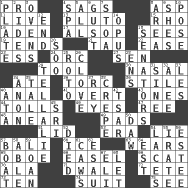 ACROSS 1. Adept person 4. Sinks 8. Viper 11. Not recorded 13. Greek god of the underworld 15. 17th letter of the Greek alphabet 16. Arabian gulf 17. Columnist Joseph or Stewart 18. Perceives with the eye 19. Is inclined (to) 21. The 19th letter of the Greek alphabet 22. Comfort 23. Curvy letter 24. The grampus (Milton) 27. Elected rep. 29. Utensil 30. Rhinal 34. Had dinner 36. Torque (variant) 39. Vertical member of a panel or frame 40. Of or related to the anus 41. Unconcealed 43. Washington bills 44. For Whom the Bell _____ 46. Sight organs 47. Portuguese money of account (variant) 48. Approach 49. Groovy apts. 51. Flaplike covering 53. Epoch 54. Untruth 57. Indonesian resort city 60. Frozen water 63. Puts on (as clothing) 65. Mitch Miller's instrument 66. Artist's stand 69. Scram! 70. Chicken ___ king 71. A sleeping potion; an opiate (poet.) 72. False hair 73. Nine, plus one 74. Set or collection 75. Observe DOWN 1. Food holder 2. Amusement-park features 3. Baking chambers 4. Health resort 5. Everything 6. Abrupt rush of wind 7. Portico 8. Length times width 9. "______ My Girl" (Turtles hit) 10. Airs 12. Conclusion 14. Musical composition 18. Legislators 20. "Barney Miller" actor Jack 25. Printing process, for short 26. Garlic unit 28. Followers of ems 29. Copy Pinocchio 31. Trig term 32. Toward shelter 33. French article 34. At once, immediately (arch.) 35. Falsehood 37. Marina Del _, California 38. Streamer paper 40. _ moment's notice (2 wds.) 42. Russian ruler of old 45. _ Lanka 50. Fool 52. Passed on 54. Shoestrings 55. Feeling or showing extreme anger 56. First name in cosmetics 57. Water vessel 58. Competent 59. Grant temporary use of 61. Crow sounds 62. Son of Isaac 64. Eastern Standard Time (abbr.) 67. Connecticut Ivy Leaguer 68. Allow
