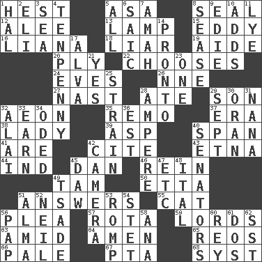 ACROSS 1. Command 5. White ___ sheet 8. Lick closed 12. Toward shelter 13. Desk light 15. Whirlpool 16. Woody, climbing, usually tropical plant 18. One who doesn't tell the truth 19. Helper 20. Travel a route regularly 22. Opts 24. Nights before holidays 26. Compass dir. 27. Political cartoonist Thomas 28. Had dinner 29. Manchild 32. A really long time 35. San ____ (Riviera town) 37. Epoch 38. Kenny Rogers chart-topper in '80 39. Viper 40. Connect, as a bridge 41. "We ___ not amused" (Victoria) 42. Quote 43. Inactive volcano in Sicily 44. Working for oneself (abbr.) 45. Daniel's nick name 46. It's straight from the horse's mouth 49. Scottish cap 50. Singer James 51. Responds (to) 55. Feline 56. Entreaty 57. Round or rotation of duties 59. Domineers 63. Among 64. So be it 65. Vintage cars 66. Light colored 67. Parent Teacher Association (abbr.) 68. System (abbr.) DOWN 1. Actor Linden 2. Biblical high priest 3. Ocean 4. 3-inch nail 5. 100% 6. Ketch in the Levant 7. Wet nurse 8. Gospel singer Marvin 9. Singer Brickell 10. Does sums 11. Potassium hydroxide 14. Right away 17. Inventor's middle name 21. It is so 23. Single 25. Put through a sieve 28. Electrical Unit 29. Back-to-school mo. 30. Northwest Algerian city 31. Nanny 32. Mountain range southwest of Kyrgyzstan 33. Merit 34. Wrote a lyric poem 36. Eastern Standard Time (abbr.) 40. Legislators 42. Device for capturing images 45. Fool 47. And so on (abbr.) 48. Slanted text style (abbr.) 49. Sadhe (variant) 51. _ mater 52. Famous astronaut Armstrong 53. Frolic 54. Proofreading order 56. Infant food 58. Santa ___, CA 60. Marina Del _, California 61. Two (Sp.) 62. Fast jet (abbr.)
