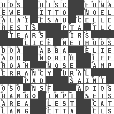 ACROSS 1. Two (Sp.) 4. Flat circle 8. Pulitzer Prize-winning author Ferber 12. She-sheep 13. "Tell ____ the Marines!" 14. Christmas carol 15. Jai _ 17. He sold his birthright 18. Cell (Danish) 19. Musical pauses 21. Parent Teacher Association (abbr.) 23. Affectionate concern, for short 24. Pulls apart 26. Big collection agency 28. Louse (plural) 30. Modes 34. ___ good deed 37. Swedish rock group 39. Writer Wiesel 40. Increase 41. 0 degrees 43. Area sheltered from the wind 44. Wander aimlessly 46. Characteristic smell of wine 47. Electrical Unit 48. The state or an instance of erring 51. Mountain range 54. Groovy apt. 55. Inhabitant of Heaven 58. Bear (Spanish) 61. Overdraft (abbr.) 63. Goodbye (Sp.) 65. Role for Stallone 67. Body of Kaffir warriors 71. Puts into a specified state 72. Type of rug 73. For fear that 74. Feline 75. Long (Scottish) 76. Singer James 77. Raised railways DOWN 1. Letter starter 2. A small or young owl 3. Gospel singer Marvin 4. Expire 5. It is 6. R.R. building 7. Overturn; upset 8. Compass dir. 9. Stupid person 10. 1994 drama film starring Jodie Foster 11. Actor Baldwin 16. Slanted text style (abbr.) 18. Haul 20. Indian title of respect (Mr.) 22. Make a knot 25. Skim 27. A female animal or person 29. Dark wood 30. Taiwanese island in East China Sea 31. Rounded earthenware pot or jar 32. South Vietnam president (1954) 33. Ooze 34. Have the gumption 35. Scent 36. The sixth month of the Jewish calendar 38. Sis' sibling 42. Possessive pronoun 45. Atlas unit 49. Billionth: prefix 50. Music discs 52. American Automobile Association (abbr.) 53. Hats (slang) 56. Sibling's daughter 57. "_____ Recall" 58. Of the mouth 59. "Two Mules for Sister ____" 60. Sign of things to come 62. Do some clerical work 64. Fast planes 66. Container for groceries 68. Was introduced to 69. Pacific Standard Time (abbr.) 70. Call ___ day