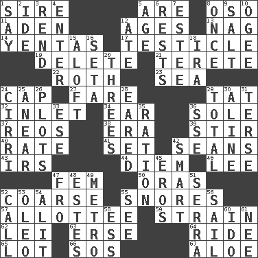 ACROSS 1. Father 5. "We ___ not amused" (Victoria) 8. Bear (Spanish) 11. An important port of Yemen 12. Matures 13. Tired old horse 14. Gossips 17. One of the two male reproductive glands 19. Erase 21. Cigar-shaped 22. Writer of Portnoy's Complaint (1969) 23. Ocean 24. Head covering 27. Conductor's collection 29. Make lace 32. An arm off of a larger body of water 34. Ewer handle 36. Flatfish 37. Vintage cars 38. Epoch 39. Tumult 40. Assign a rank or rating to 41. Put into a specified state 42. Seines 43. Big collection agency 44. South Vietnam president (1954) 46. Area sheltered from the wind 47. Opposite of masc. 50. Mouths or openings 52. Unrefined 55. Sounds asleep 57. One to whom something is allotted 59. Put through a sieve 62. Luau accessory 63. Celtic language 64. Travel on an animal 65. Car dealer's back yard 66. Distress signal 67. _ vera DOWN 1. Declare 2. Binary compound 3. Tear apart 4. Keyboard key 5. Personal question 6. Musical pauses 7. First name in cosmetics 8. At one time in the past 9. Table seasoning 10. Double curve, resembling the letter S 12. Had dinner 15. High up in or into the air 16. Stalk of a moss capsule 18. Lyricist Gershwin 20. Threesomes 24. High-altitude cloud 25. Approach 26. Schemes 28. Having ears or earlike features 29. Add up to 30. Place in a line 31. Laconic 33. Compass dir. 35. Food allowance for one day 36. Compass dir. 42. Don Adams' spy role 45. Greek god of love 47. From 48. _____ Park, CO 49. Paris' subway 51. Father Junipero _ 52. Give a ring to 53. Butter sub 54. Came down and settled, as after flight 55. Perceive with the eye 56. Move on water 58. Curvy letter 60. Wedding promise 61. Born