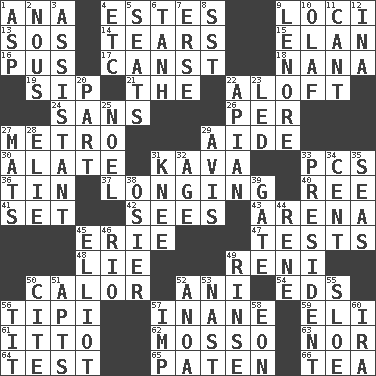 ACROSS 1. Santa ___, CA 4. _____ Park, CO 9. Venues 13. Distress signal 14. Separates forcefully 15. Enthusiasm 16. Product of festering 17. 2nd pers. sing. pres. of can (arch.) 18. Nanny 19. Small drink 21. Definite Article 22. Upward 24. Without 26. For each 27. Paris' subway 29. Helper 30. Having winglike extensions 31. Polynesian shrub of the pepper family 33. Personal Computers (abbr.) 36. Metal container 37. Yearning 40. To sift 41. Put into a specified state 42. Perceives with the eye 43. Sports stadium 45. 4th largest of the Great Lakes 47. Trials 48. Whopper 49. Painter Guido (1575-1642) 50. Bodily heat indicating an inflammation 52. Cuckoo 54. Begley and Asner 56. Native american tent (variation) 57. Lacking in sense or substance 59. Biblical high priest 61. "Tell ____ the Marines!" 62. With motion or animation 63. Not either 64. Trial 65. Eucharist need 66. Beverage made from leaves DOWN 1. Viper 2. Good sense 3. Helper 4. And so on (abbr.) 5. Theater features 6. Hyperbolic tangent 7. Celtic language 8. Fast jet (abbr.) 9. Poe poem 10. Norwegian king 11. Patter 12. _ tizzy (2 wds.) 20. Piece 22. Bee-related 23. Directed 25. Christmas carol 27. Floor coverings 28. Writer Wiesel 29. Opinion 31. Leg joint 32. Personal question 33. Elected leader of a country 34. Penny 35. Oceans 38. Flexible twig of a willow tree 39. Yard entry 44. French philosopher Descartes 45. American author Paul (1891-1958) 46. _ de Janeiro 49. Remove soap 50. Quote 51. Flats, for short 52. Small Philippine buffalo 53. Political cartoonist Thomas 55. _ gin 56. Teat (slang) 57. Naughty child 58. A really long time 60. Retirement account (abbr.)