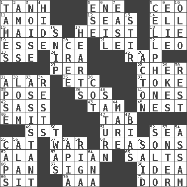 ACROSS 1. Hyperbolic tangent 5. Compass dir. 8. Corporate head (abbr.) 11. Mine, in Marseilles 12. Oceans 14. Pipe bend 15. Unmarried girls 17. Robbery 18. Falsehood 19. Core 21. Flowery wreath 22. Lion 23. Compass dir. 24. Retirement account (abbr.) 25. Reproach for some lapse or misdeed 27. For each 28. "Mermaids" star 31. Having or resembling wings 35. And so on (abbr.) 37. Puff or smoke 38. Airs 39. Distress signal 41. Singles 42. Backtalk 43. Scottish cap 45. A home for chicks 46. Send forth 47. Bar bill 49. Fast jet (abbr.) 51. RI univ. 52. Ocean 55. Feline 57. Armed conflict 60. Thinks logically 62. Insect wing 63. Bee-related 65. Table seasonings 66. Baking dish 67. Signal 68. The content of cognition 69. Be seated 70. American Automobile Association (abbr.) 71. Dormintory (informal) DOWN 1. Makes less strong or intense 2. Collect or gather 3. Annoying sound 4. Flintstone garb 5. Compass dir. 6. Famous astronaut Armstrong 7. Relaxation 8. Portable communications device 9. Writer Wiesel 10. Margarine 13. Commotion 16. Sever or remove by pinching or nipping 17. Centers 20. Algonquian 26. NE Massachussets city 29. Supplements with great effort 30. Repose 31. Domed church section 32. Rich soil 33. Helper 34. Musical pauses 36. Small bed 40. Titan orbits this 44. Female horse 48. Prejudice 50. It was, poetically 52. Twentieth part of a lira 53. Keyboard key 54. Indian state 55. Balmoral and tarboosh 56. Jai _ 58. Capital of Western Samoa 59. Port city in Latvia 61. Alleged 64. Santa ___, CA