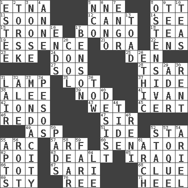 ACROSS 1. Inactive volcano in Sicily 5. Compass dir. 8. Baseball player Mel 11. Within a short period 12. Patter 14. Observe 15. Marketplace scale 17. Beat drum 18. Beverage made from leaves 19. Center 21. Mouth or opening 22. Followers of ems 23. Supplement with great effort 24. Spanish title 25. Lair 27. Distress signal 28. Russian ruler of old 31. Desk light 35. Car dealer's back yard 37. Flintstone garb 38. Toward shelter 39. Allow head to fall sleepily 41. "Terrible" tsar 42. Charged atoms 43. Soggy 45. An absolute certainty 46. Redecorate 47. Title for a knight 49. Cleo's killer 51. Binary compound 52. R.R. building 55. Curve 57. Sandy's bark 60. Legislator 62. Luau course 63. Started a card game 65. Resident of Iraq 66. Small child 67. Indian skirt 68. A slight indication 69. Filthy place 70. Portuguese money of account (variant) 71. Person who is morally reprehensible DOWN 1. First name in cosmetics 2. Cod relative 3. Trap for birds or small mammals 4. Queen of England 1702-14 5. Non-commissioned officer (abbr.) 6. Billionth: prefix 7. Engineer (abbr.) 8. Clearly or manifestly demonstrative 9. Adolescent 10. Afternoon social gatherings 13. Frog relative 16. Conclusions 17. Gillaume's butler role 20. Calm and collected 26. Principle of right and wrong 29. The sixth month of the Jewish calendar 30. Monthly bill 31. Den 32. Medicinal plant 33. Ananias' fault 34. Mexican monetary units 36. Pull behind 40. Stop 44. Periodic rise and fall of the sea level 48. Painter Guido (1575-1642) 50. Writing tablets 52. Having lost freshness 53. Woman's close-fitting hat 54. Satellite of Uranus 55. Tenement units (abbr.) 56. Carrot, for example 58. Posterior 59. Conductor's collection 61. Bowlike part 64. Untruth