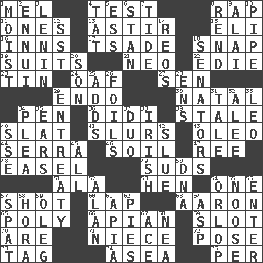 ACROSS 1. Cartoonist voice _ Blanc 4. Trial 8. Strike 11. Singles 13. Moving or stirring 15. Biblical high priest 16. Taverns 17. Sadhe (variant) 18. Fastener 19. Sets of matching outer garments 21. Modern: prefix 22. Singer Brickell 23. Metal container 24. Clumsy lout 27. Elected rep. 29. Inside; within (prefix) 30. Brizilian seaport 34. Animal enclosure 36. "You Light Up My Life" star Conn 39. Showing deterioration from age 40. Narrow board 41. Runs notes together 43. Margarine 44. Father Junipero _ 46. The visible part of the earth's surface 47. To riddle 48. Artist's stand 49. Soap bubbles 51. Wing 53. Layer 54. Single 57. Guess 60. Infant locale 63. Composer Copland 65. Many (prefix) 66. Bee-related 69. Position in a hierarchy or organization 70. "We ___ not amused" (Victoria) 71. Sibling's daughter 72. Airs 73. Label 74. Toward the sea 75. For each DOWN 1. Wet 2. World-weariness 3. Soviet premier 1918-24 4. Make lace 5. Curvy letter 6. Comedian Laurel of Laurel & Hardy 7. Event that recurs at intervals 8. Tear apart 9. Jai _ 10. Corncob 12. Fast jet (abbr.) 14. Vintage cars 18. Legislators 20. Boy, to dad 25. Does sums 26. Fencing necessities 28. Followers of ems 29. Plea 31. Lie 32. Toward shelter 33. Lion 34. Entreaty 35. Hearing organs 37. Superhero pair 38. From or relating to Ireland 40. Compass dir. 42. Change direction abruptly 45. Everything 50. Heredity factor (abbr.) 52. Actor Alda or Thicke 54. Fourth or lowest deck 55. Trap for birds or small mammals 56. Keyboard key 57. Petty quarrel 58. Israeli folk dance 59. Cassini of fashion 61. Capital of Western Samoa 62. Sliced desserts 64. Viper 67. Adept person 68. Teachers' org.