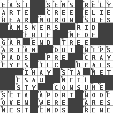ACROSS 1. Compass direction 5. Elected reps. 9. Trust 13. Johnson of "Laugh-In" 14. Algonquian 15. Writer Wiesel 16. Bring up, as a child 17. Person of subnormal intelligence 18. Institutes legal proceedings 19. Replies 21. To free from 22. 4th largest of the Great Lakes 23. Ancient Persian 24. Slender fish 27. Conclusion 28. Family _ (genealogy) 29. Believer in; advocate of (suffix) 31. Fr. "Yes" 32. Pinches, bites 36. Writing tablets 37. Before (prefix) 38. Supercomputer manufacturer 39. Sight organs 40. Affectionate concern, for short 41. Allots cards 42. "If ____ say so..." 44. R.R. building 46. Remaining after all deductions 47. He sold his birthright 48. Famous astronaut Armstrong 50. Filthy place 51. Ingest 54. Stalk of a moss capsule 56. To the left, to Queeg 58. Thickened enlargement 60. Baking chamber 61. We are 62. Ancient Greek god of war 63. A home for chicks 64. Extremities 65. French philosopher Descartes DOWN 1. Hearing organ 2. Type of rug 3. Comedian Laurel of Laurel & Hardy 4. Laconic 5. Tallied 6. Blunders 7. Modern: prefix 8. Elected rep. 9. Home 10. Evade 11. Falsehood 12. It is so 17. Count _ (2 wds.) 20. Songbird 21. To sift 23. Medical imaging device (abbr.) 24. Yawn 25. Like ___ of sunshine 26. Travel on an animal 28. Third day of the wk. 30. Helper 31. The grampus (Milton) 33. SW Asia republic 34. Diluted with white 35. System (abbr.) 37. Strand of rope, yarn or thread 40. The 19th letter of the Greek alphabet 41. Raised platform 43. Can I? 44. Sounds asleep 45. Portable shelter 47. _____ Park, CO 49. Type of eclipse 51. Drawstring 52. Greater amount 53. Locale of original sin 54. Boy, to dad 55. First lady 56. Deep reverence 57. Animal enclosure 59. Compass dir.