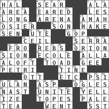 ACROSS 1. Actor Linden 4. Burn superficially 8. In the manner of 11. Length times width 13. Having ears or earlike features 15. French article 16. Yearn 17. Sports stadium 18. Housemaid 19. Flexible twig of a willow tree 21. Manchild 22. Cause to be 23. Elected rep. 24. Shoshoni 27. Grand Old Party 29. To provide with a ceiling 30. Spanish missionary in California 34. Away 36. Confederate soldiers (slang) 39. Constellation of myth 40. The Jewish people; Israel 41. Learning spot: Fr. 43. Silent film actress Nazimova 44. Upward 46. Frog relative 47. Unit of force equal to gravity 48. _ dish (used to culture cells) 49. Prong on a fork 51. Baseball player Mel 53. And so on (abbr.) 54. Air pressure measure (abbr.) 57. ____ Bator, Mongolia 60. Cleo's killer 63. Stares 65. Political cartoonist Thomas 66. Join together 69. Shout 70. Ending with capital 71. Drinks excessively 72. Light colored 73. Beverage made from leaves 74. Gone 75. Fast jet (abbr.) DOWN 1. Saint headwear 2. Came up 3. Soviet premier 1918-24 4. Ocean 5. Ewer handle 6. Ancient Greek god of war 7. Western Nevada city 8. _ mater 9. Path through which fluid escapes 10. American tennis player Robert 12. Personal question 14. Mild oath, euphamism for damn 18. Electrical Measurement 20. Sorrow 25. Hoop that covers a wheel 26. Voters do this 28. Bear (Spanish) 29. Meet 31. Cause heat under the collar 32. Hero or heavy, e.g. 33. Santa ___, CA 34. Do some clerical work 35. Carrot, for example 37. Surprise greeting 38. Schedule 40. Plant excrement 42. Prepare for publication 45. Teat (slang) 50. Non-commissioned officer (abbr.) 52. Pulled tight 54. Entreaties 55. Exchanges for money 56. Small island 57. A single undivided whole 58. Goldbrick 59. Toward the sea 61. Frozen precipitation 62. Corncob 64. Hustle 67. Nine, plus one 68. Eastern Standard Time (abbr.)