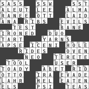 ACROSS 1. Backtalk 5. Compass dir. 8. Fast jet (abbr.) 11. Native American of Southwest Alaska 13. Area sheltered from the wind 14. _ mater 15. The wife of a rajah (variant) 16. Baseball player Mel 17. Put down 18. Santa ___, CA 19. Chest bones 21. Vices 22. Trial 24. Object of repulsion 25. Pressed 27. Superhero pair 29. Small pie 30. Tall tales 32. Domed church section 33. Ancient Celtic tribe of eastern Britain 35. Opening into or through something 39. Amusement-park features 41. Baking chamber 42. Modern: prefix 43. Cylindrical with tapered ends 45. Implement 48. One who makes use of a thing 49. Sycophant 50. Collude with 52. To free from 55. Von Bismarck 56. Retirement account (abbr.) 57. Dodge 59. Cowardly lion portrayer 60. Cartoonist voice _ Blanc 61. Eroded 62. Raised railways 63. Air pressure measure (abbr.) 64. Afternoon social gatherings DOWN 1. "Two Mules for Sister ____" 2. Actor Alda or Thicke 3. Legislators 4. Institute legal proceedings 5. Oscar Madison type 6. Puts into a specified state 7. Soggy 8. Killed 9. Grin 10. Small boys 12. Laconic 14. Inventor's middle name 20. It would 21. Inky black, to poets 23. Keyboard key 25. Call ___ day 26. Strike 27. One of the 12 tribes of Israel 28. RI univ. 30. Affirmative reply 31. Dinah or Pauly 33. Binary compound 34. Corporate head (abbr.) 36. Make much ado about nothing 37. Allow 38. Compass dir. 40. Inwardly 43. Third day of the wk. 44. First name in cosmetics 45. "_____ Recall" 46. Curses 47. Scent 49. Lacquered or enameled metalware 50. Ancient Greek god of war 51. Indonesian resort city 53. The main thing one is thinking about 54. Lairs 56. Mischievous child 58. Large container