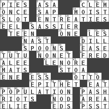 ACROSS 1. Sliced desserts 5. White ___ sheet 8. Clement's nick name 12. At one time in the past 13. Plant excrement 14. Wet 15. Narrow, elongated depression 16. Pleas 19. Snakelike fish 20. More lively and spirited 21. Adolescent 23. Single 24. French article 27. Political cartoonist Thomas 30. Deli pickle 31. Soup utensils 34. Relaxation 35. Ballerina skirt 38. Music written for nine 40. Flintstone 41. Toward shelter 42. Poe poem 44. Floor protectors 45. Portico 46. Compass dir. 47. Curvy letter 50. "Beetle Bailey" pooch 53. Curse 57. Erode 59. Census information 63. Romantic infatuation 64. Debaucheries 65. Dreamland 66. Type of rug 67. Writer Wiesel 68. Begley and Asner 69. Inconspicuous attention getter DOWN 1. Introduce or present, as a question 2. An arm off of a larger body of water 3. Learning spot: Fr. 4. Put into a specified state 5. Toward the sea 6. Without 7. Flats, for short 8. Small bed 9. Cards in a Roman deck? 10. Compass dir. 11. Mountains (abbr.) 14. Female horse 17. _ de Janeiro 18. Car or cant ending 20. Fastener 22. Takes place subsequently 24. One who doesn't tell the truth 25. Otherwise 26. Downhill vehicle 28. Boy, to dad 29. Implement 30. Outscore 32. Compass dir. 33. Elected reps. 35. Not wild 36. ____ Bator, Mongolia 37. False hair 39. Small child 43. Carrot, for example 47. Snakelike fish 48. Health resort 49. Be seated 51. Rends 52. Fertile tracts in a desert 54. Prong on a fork 55. Parka part 56. Conclusions 58. Not this but _ 59. Before (prefix) 60. Lubricate 61. Luau course 62. Shoshoni 63. Infant food