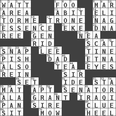 ACROSS 1. Electrical Unit 5. Egg _ yung 8. Third mo. 11. Length times width 12. "This won't hurt ____!" 14. Connecticut Ivy Leaguer 15. Singer Mel 17. Marketplace scale 18. Tired old horse 19. Center 21. Make supply last 22. Heredity factor (abbr.) 23. Portuguese money of account (variant) 24. Commissioned military rank (abbr.) 25. Teachers' org. 27. To free from 28. Get outta here! 31. Fastener 35. Area sheltered from the wind 37. Prong on a fork 38. Expression of disdain 39. June honoree 41. Inactive volcano in Sicily 42. In addition 43. Beverage made from leaves 45. Snake ____ (dice throw) 46. It's straight from the horse's mouth 47. Title for a knight 49. Put into a specified state 51. Binary compound 52. R.R. building 55. Floor covering 57. Fitting 60. Legislator 62. In the manner of 63. Monetary aid 65. Resident of Iraq 66. Baking dish 67. Title for a man of rank and authority 68. A slight indication 69. Be seated 70. Cut the grass 71. Person who is morally reprehensible DOWN 1. Wetness 2. Came up 3. Laconic 4. Docile 5. At a great distance 6. Mitch Miller's instrument 7. Pig sound 8. Ananias' fault 9. Actor Alda or Thicke 10. Port city in Latvia 13. Adolescent 16. Engineer (abbr.) 17. Watched over 20. To provide with a ceiling 26. First name in cosmetics 29. Queen of England 1702-14 30. Beverages made from leaves 31. Practice fight 32. The longest river in the world 33. Helper 34. Give a jingle 36. Erode 40. Stop 44. Assistant 48. Painter Guido (1575-1642) 50. Labels 52. Lacking originality or spontaneity 53. Woman's close-fitting hat 54. Satellite of Uranus 55. Atlas contents 56. Mountain range southwest of Kyrgyzstan 58. Demure 59. Pacific island yam 61. Bowlike part 64. ___ Haven, CT
