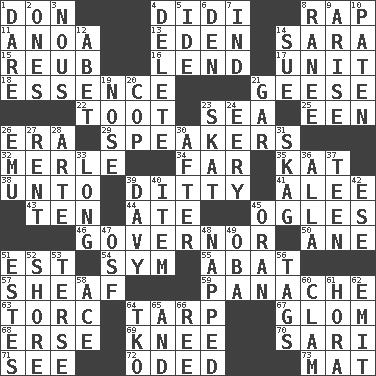 ACROSS 1. Spanish title 4. "You Light Up My Life" star Conn 8. Reproach for some lapse or misdeed 11. Small Philippine buffalo 13. Genesis locale 14. "Two Mules for Sister ____" 15. Reuben's nickname 16. Grant temporary use of 17. A single undivided whole 18. Gist 21. Honkers 22. A blast of a horn 23. Ocean 25. Car or cant ending 26. Period 29. Orators 32. Haggard of country music 34. Distant 35. Krazy ___ of comics 38. To (old English) 39. Short, simple song 41. Toward shelter 43. Nine, plus one 44. Had dinner 45. Stares at amorously 46. State head 50. One (Scot) 51. Eastern Standard Time (abbr.) 54. Symbol (abbr.) 55. Blind as ____ 57. Archer's quiver 59. Flamboyance 63. Torque (variant) 64. Canvas cover 67. Take by theft 68. Celtic language 69. Leg joint 70. Indian skirt 71. Observe 72. Wrote a lyric poem 73. Floor covering DOWN 1. Have the gumption 2. Singles 3. Good sense 4. Erase 5. Binary compound 6. Lair 7. Indiana (abbr.) 8. The wife of a rajah (variant) 9. Ascend 10. Eucharist need 12. Collude with 14. Institute legal proceedings 19. Characteristic smell of wine 20. Police officer (slang) 21. Slender fish 23. Three-handed card game 24. Suggestive of the supernatural 26. Australian flightless bird 27. Monthly bill 28. Johnson of "Laugh-In" 30. Following 31. Heroin 33. Having great length 36. Silent film actress Nazimova 37. Adolescent 39. American folk hero Crockett 40. A whole individual unit 42. Compass dir. 45. NW Algerian seaport 47. Order of Saint Francis (abbr.) 48. Slept 49. Chief or king in Benin or Nigeria 51. _____ Park, CO 52. Dinah or Pauly 53. Laconic 56. Labels 58. Adept person 60. Dollar (slang) 61. Israeli folk dance 62. Give off 64. Ring climax 65. Added to 66. Portuguese money of account (variant)