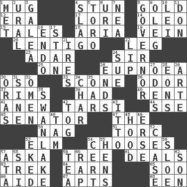 ACROSS 1. Java container 4. Surprise greatly 8. Gilt 12. Period 13. Old wives' tales, e.g. 14. Butter sub 15. Stories 18. Roberta Peters solo 19. Distinctive style or manner 20. Small, flat, pigmented spot on the skin 22. Part of a journey 23. The sixth month of the Jewish calendar 24. Title for a knight 25. Single 26. Normal relaxed breathing 30. Bear (Spanish) 33. Biscuitlike quick bread 36. Aroma 37. Basketball hoops 39. Possessed 40. Monthly bill 41. Afresh 42. Tarsus (plural) 44. Compass dir. 45. Legislator 47. Definite Article 50. Tired old horse 51. Torque (variant) 53. Shade tree 54. Elects 57. "____ silly question..." 59. Family _ (genealogy) 61. Allots cards 63. Long journey 64. Merit 65. "Barney Miller" actor Jack 66. Helper 67. Tenement units (abbr.) 68. Car or cant ending DOWN 1. Was introduced to 2. Mountain range 3. An organ shaped like a helmet 4. Volcanic refuse 5. "Corrida" creature 6. RI univ. 7. Teachers' org. 8. Head of state? 9. Cassini of fashion 10. Flowery wreath 11. Spanish title 16. Inside; within (prefix) 17. Comedian Laurel of Laurel & Hardy 21. Angers 22. Mouth edge 24. Take to court 26. Extremities 27. Lyric poems 28. Immeasurably long periods of time 29. Johnson of "Laugh-In" 30. Mouths or openings 31. Trig term 32. Sign of things to come 34. Burn to charcoal 35. Rowing implement 38. Tchaikovsky ballet 42. Coat; cloak 43. "Tell ____ the Marines!" 46. Scottish cap 48. Parka part 49. Celtic language 52. Desist 53. Made supply last 54. Foregone conclusion 55. Coop moms 56. A type of plum 57. _ moment's notice (2 wds.) 58. _ Lanka 59. Beverage made from leaves 60. Reproach for some lapse or misdeed 62. Manchild