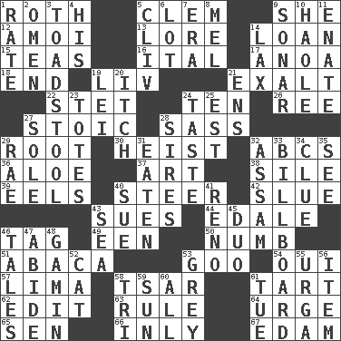ACROSS 1. Writer of Portnoy's Complaint (1969) 5. Clement's nick name 9. A female animal or person 12. Mine, in Marseilles 13. Old wives' tales, e.g. 14. Grant temporary use of 15. Beverages made from leaves 16. Slanted text style (abbr.) 17. Small Philippine buffalo 18. Conclude 19. 54 in ancient Rome 21. Glorify 22. Proofreading order 24. Nine, plus one 26. Portuguese money of account (variant) 27. Unemotional 28. Backtalk 29. Carrot, for example 30. Robbery 32. Lettered men learn these first 36. _ vera 37. Nonscientific branch of learning 38. Drop; flow; fall 39. Snakelike fish 40. Guide 42. Change direction abruptly 43. Institutes legal proceedings 44. Peak District village in England 46. Label 49. Car or cant ending 50. Unfeeling 51. Phillipine bananalike plant 53. Thick or sticky substance 54. Fr. "Yes" 57. Pale green bean 58. Russian ruler of old 61. Small pie 62. Prepare for publication 63. Governing power 64. Goad 65. Elected rep. 66. In an inward manner 67. Dutch treat DOWN 1. Pace 2. Presage 3. Inedible or poisonous agaric 4. Part of HMS, perhaps 5. 154 in Roman numerals 6. Car dealer's back yard 7. Period 8. Cartoonist voice _ Blanc 9. Underwater navigation system 10. White Person, in Hawaii 11. Maternal 14. Not strict 19. Flowery wreath 20. Hankering 21. Followers of ems 23. Hauls 24. Clothes sense 25. Eastern Standard Time (abbr.) 27. Flatfish 28. Begets 29. Actress Charlotte 31. Eroded 32. Indian state 33. Big road sign 34. A slight indication 35. Perceive with the eye 40. Take to court 41. Former U.S. Attorney General Janet 43. Ocean 45. Superhero pair 46. Falsehoods 47. Remain 48. Homeless child 52. Domesticated feline 53. Jennifer or Joel 55. Capital and largest city of Mongolia 56. A distinct part 58. Three (prefix) 59. Player for Phoenix 60. 100% 61. Third day of the wk.