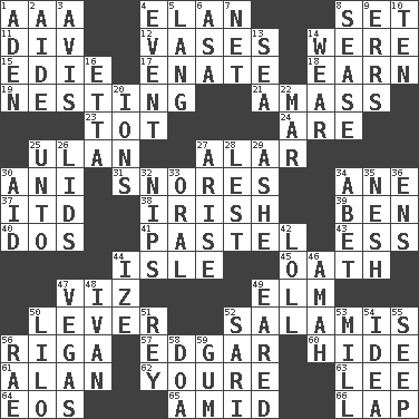 ACROSS 1. American Automobile Association (abbr.) 4. Liveliness 8. Put into a specified state 11. HTML Container Element 12. Flower holders 14. Past tense of be (plural) 15. Singer Brickell 17. Maternal 18. Merit 19. Inhabiting a nest 21. Collect or gather 23. Small child 24. "We ___ not amused" (Victoria) 25. Uhlan (variant) 27. Having or resembling wings 30. Black tropical American cuckoo 31. Sounds asleep 34. A saturated hydrocarbon 37. It would 38. From or relating to Ireland 39. Benjamin's nick name 40. Two (Sp.) 41. Soft color 43. Double-curved letter 44. Capri or Wight 45. Pledge 47. That is 49. Shade tree 50. Prying instrument 52. Deli grouping 56. Capital of Latvia 57. _ Allan Poe 60. Flintstone garb 61. Actor Alda or Thicke 62. You are 63. Area sheltered from the wind 64. Greek goddess of the dawn 65. Among 66. Pet locale DOWN 1. An important port of Yemen 2. Assistant 3. Advice 4. Incident 5. Long (Scottish) 6. White ___ sheet 7. Fish or hair follower 8. Gospel singer Marvin 9. Blunders 10. Nine, plus one 13. Ocean 14. Erode 16. Singer James 20. Charged atoms 22. Impair 25. To (old English) 26. Flaplike coverings 27. Get up 28. For fear that 29. American tennis player Robert 30. Assist 32. Cuts off 33. Of the mouth 34. Collude with 35. Tender 36. Followers of ems 42. Hang loosely or laxly 44. Ending with capital 46. Nursemaid 47. Viva Las _ 48. "Terrible" tsar 49. Having ears or earlike features 50. _ and Stitch 51. Marina Del _, California 52. Indian skirt 53. Place where flour is made 54. The main thing one is thinking about 55. Ooze 56. Actress Charlotte 58. ___ good deed 59. Chewing product
