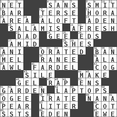 ACROSS 1. Remaining after all deductions 4. Without 8. Stricken, poetically 12. Soap unit 13. Laconic 14. Israeli folk dance 15. Length times width 17. High up in or into the air 18. An important port of Yemen 19. Deli grouping 21. Anew 23. Male parent 24. Unit of force equal to gravity 26. Begley and Asner 27. Among 28. "______ My Girl" (Turtles hit) 30. Black tropical American cuckoo 31. Spoke pompously 34. Prohibit 37. Cartoonist voice _ Blanc 38. Indian princess (variant) 39. According to 40. Leather borer 41. Bundle 42. Gear tooth 43. Drop; flow; fall 44. Create 46. Set 47. Hit sharply and swiftly 50. Followers of ems 51. Place where plants grow 54. Portable computers 57. Double curve, resembling the letter S 58. Feeling or showing extreme anger 60. Grandmother 62. Lightbulb-shaped fruit 63. 61 cubic inches 64. Small bed 65. Fast planes 66. Locale of original sin 67. She-sheep DOWN 1. Basketball assoc. 2. Hearing organs 3. Excercise machine 4. Major League Baseball Commissioner Bud 5. Came up 6. Science/research agcy. 7. Stalk of a moss capsule 8. Pottery fragments 9. Methods 10. Angers 11. Hyperbolic tangent 13. Scottish cap 16. Jai ____ 20. Increase 22. Nourish 25. First name in cosmetics 27. Afresh 29. The bottom of a shoe or boot 30. Wet nurse (var.) 31. Spoken 32. Less widely known 33. Added to 34. Keyboard key 35. Medicinal plant 36. Tired old horse 41. Do some clerical work 43. Spring feasts 44. Was introduced to 45. Soon (poet.) 46. Relatively large 48. Having winglike extensions 49. Eucharist need 51. Republicans 52. Matures 53. The longest river in the world 55. For each 56. Overwhelm 59. To free from 61. Had dinner