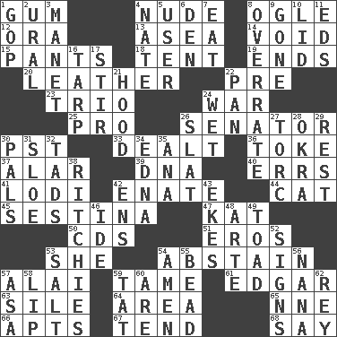 ACROSS 1. Chewing product 4. Naked 8. Stare 12. Mouth or opening 13. At sea 14. Nothingness 15. Leg coverings 18. Portable shelter 19. Extremities 20. Cordwainer's material 22. Before (prefix) 23. Musical group of three 24. Armed conflict 25. Adept person 26. Elected representative 30. Pacific Standard Time (abbr.) 33. Started a card game 36. Casino tip 37. Having or resembling wings 39. Heredity factor (abbr.) 40. Blunders 41. Farming town in central California 42. Related on the mother's side 44. Feline 45. French poetic form 47. Krazy ___ of comics 50. Music discs 51. Greek god of love 53. A female animal or person 54. Choose not to consume 57. Mountain range southwest of Kyrgyzstan 59. Not wild 61. _ Allan Poe 63. Drop; flow; fall 64. Length times width 65. Compass dir. 66. Flats, for short 67. Look after 68. Declare DOWN 1. Republican Party 2. Mountain range 3. French painter Edouard 4. Nathan's nickname 5. One who uses or employs something 6. Lair 7. Ingest 8. Make much ado about nothing 9. Went 10. Hat (slang) 11. Begley and Asner 16. Canvas cover 17. Use a swizzle stick 21. Parka part 22. Baking dish 24. Dripping 26. Narrow board 27. Torque (variant) 28. Gumbo ingredient 29. Relief 30. Friends 31. A type of plum 32. Small amounts or degrees 34. Pulitzer Prize-winning author Ferber 35. Santa ___, CA 38. Actors Guy, Robert Welles, and Clint 42. Followers of ems 43. Supplements with great effort 46. Binary compound 48. Johnson of "Laugh-In" 49. Frog relative 52. Omens 53. Table seasoning 54. So be it 55. Necklace unit 56. Grandmother 57. White ___ sheet 58. Mouth edge 59. Make lace 60. "We ___ not amused" (Victoria) 62. Marina Del _, California