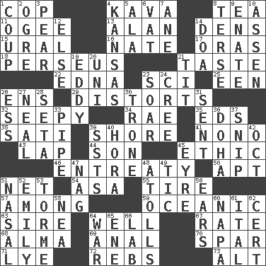 ACROSS 1. Police officer (slang) 4. Polynesian shrub of the pepper family 8. Beverage made from leaves 11. Double curve, resembling the letter S 13. Actor Alda or Thicke 14. Lairs 15. Mountain range 16. Nathan's nickname 17. Mouths or openings 18. Son of Zeus who helped slay Medusa 21. Clothes sense 22. Pulitzer Prize-winning author Ferber 23. _-fi 25. Car or cant ending 26. Followers of ems 29. What propaganda does 32. Oozy 34. Actress Charlotte 35. Begley and Asner 38. Suttee (variant) 39. Dinah or Pauly 41. Words to Nanette 43. Pet locale 44. Manchild 45. Moral principle 46. Plea 50. Fitting 51. Remaining after all deductions 54. White ___ sheet 55. Become fatigued 57. Amid 59. Pertaining to the sea 63. Father 64. Not ill 67. Pace 68. _ mater 69. Of or related to the anus 70. Coast Guard woman 71. Sodium hydroxide 72. Confederate soldiers (slang) 73. Keyboard modifier key DOWN 1. Clever action or accomplishment 2. Legendary monster 3. Lightbulb-shaped fruit 4. Sunflower state 5. According to 6. Large container 7. One (Scot) 8. Laconic 9. Maternal 10. NE Netherlands city 12. Otherwise 14. ___ good deed 19. Whirlpool 20. Single; one (prefix) 21. Teat (slang) 23. Fly high 24. Algonquian 26. Curvy letter 27. Be tempered by heat 28. Stalk of a moss capsule 30. Marketplace scale 31. Posted 33. Corncob 36. Capital of the state of Qatar 37. Clip 39. Fast planes 40. Israeli folk dance 42. Sep. follower 45. Jane of fiction 47. Tired old horse 48. Ringlike coral islands and reefs 49. Nervous spasm 51. Relating to the nose 52. Poet Dickinson 53. Singer Mel 56. Hearing organs 58. Teachers' org. 60. California wine valley 61. Slanted text style (abbr.) 62. Certainty 64. Armed conflict 65. Compass dir. 66. Experiment locale