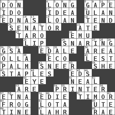 ACROSS 1. Spanish title 4. Yearn 8. Open wide 12. Wedding promise 13. It may be bright or harebrained 14. ____ Bator 15. Ferber et al. 18. Grant temporary use of 19. Be inclined (to) 20. Legislator 22. Had dinner 23. Edible starchy tuberous root 24. Australian flightless bird 25. Mouth edge 26. Catching in a trap 30. Girls' org. (abbr.) 33. Peak District village in England 36. Type of rug 37. Spanish pot 39. Environmental prefix 40. For fear that 41. Inside of hand 42. Scornful expression 44. A female animal or person 45. Paper fasteners 47. Begley and Asner 50. Sight organ 51. Anneal 53. "We ___ not amused" (Victoria) 54. Hard copy producer 57. Inactive volcano in Sicily 59. Singer Brickell 61. The easternmost of the Lesser Sundas 63. Tree-dwelling hopper 64. Globular water bottle used in Asia 65. Shoshoni 66. Prong on a fork 67. Cowardly lion portrayer 68. Actress Charlotte DOWN 1. Expire 2. Likelihood 3. Music written for nine 4. _ and Stitch 5. Scent 6. Teachers' org. 7. Separate the seeds from cotton 8. From the throat 9. Toward shelter 10. Baking dish 11. Conclusion 16. Of or related to the anus 17. Indian skirt 21. Drink excessively 22. Wet nurse (var.) 24. Compass dir. 26. A type of plum 27. Angers 28. Tender 29. Yard entry 30. Republicans 31. Narrow board 32. Silent film actress Nazimova 34. Lairs 35. Adept person 38. Electrical Measurement 42. Observe 43. Painter Guido (1575-1642) 46. Potassium hydroxide 48. Undesirable depression on a surface 49. Suttee (variant) 52. Arboreal primate 53. At once, immediately (arch.) 54. Essential or central part 55. Tail end 56. Roll call or roster of names 57. Lizard (obsolete) 58. Three (prefix) 59. Pipe bend 60. ___ good deed 62. To separate or throw off