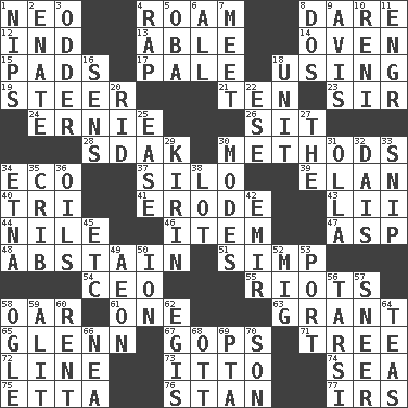 ACROSS 1. Modern: prefix 4. Wander 8. Have the gumption 12. Working for oneself (abbr.) 13. Competent 14. Baking chamber 15. Groovy apts. 17. Light colored 18. Putting into practice 19. Guide 21. Nine, plus one 23. Title for a knight 24. Bert's buddy 26. Be seated 28. Neighbor of Neb. 30. Modes 34. Environmental prefix 37. Grain storage tower 39. Style 40. Three (prefix) 41. Wear away 43. Cards in a Roman deck? 44. "Death on the ____" 46. A distinct part 47. Cleo's killer 48. Refrain by choice 51. Simple or foolish person 54. Corporate head (abbr.) 55. Disturbances 58. Boat paddle 61. Single 63. Monetary aid 65. American astronaut and politician John 67. Republicans 71. Relationship diagram 72. Actor's bit 73. "Tell ____ the Marines!" 74. Ocean 75. Singer James 76. Comedian Laurel of Laurel & Hardy 77. Big collection agency DOWN 1. Cuts off 2. Related on the mother's side 3. More peculiar 4. Strike 5. Chief or king in Benin or Nigeria 6. 100% 7. Rendezvous 8. Two (Sp.) 9. Opinion 10. Painter Guido (1575-1642) 11. Engineer (abbr.) 16. Elected reps. 18. A single undivided whole 20. To free from 22. Compass dir. 25. Relaxation 27. Definite Article 29. Japanese brewing company 30. Methods 31. Rounded earthenware pot or jar 32. Raised platform 33. Sever or remove by pinching or nipping 34. Inactive volcano in Sicily 35. Baby bed with high sides 36. Lubricates 38. Car dealer's back yard 42. Independent ruler or chieftain 45. And so on (abbr.) 49. A really long time 50. Electrically charged atom 52. Russian fighter aircraft 53. Left side of a ship or aircraft 56. Tarsus (plural) 57. Contemptuous expression 58. Stare at amorously 59. Came down and settled, as after flight 60. Monthly bill 62. The front part of a cuirass 64. Afternoon social gatherings 66. Teachers' org. 68. Baseball player Mel 69. Parent Teacher Association (abbr.) 70. Boy, to dad