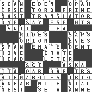 ACROSS 1. Examine minutely or intensely 5. Locale of original sin 9. Brightly colored fish 13. Celtic language 14. "Corrida" creature 15. A-one 16. Political cartoonist Thomas 17. Interpreter 19. Color 20. Declare 21. Compass dir. 22. Part of HMS, perhaps 23. In a ____ (agitated or irritated) 25. Afternoon social gathering 26. Amusement-park features 30. Plant excrements 34. Greek mythologigal hunter 35. Nights before holidays 36. Connect, as a bridge 39. Related on the mother's side 42. Gouge 43. Hub of activity 44. Feeling or showing extreme anger 46. Froth on beer 47. 61 cubic inches 48. _-fi 51. "____ silly question..." 54. Call ___ day 57. Rowing implement 58. Drinking establishment 60. Big collection agency 62. Complicated, petty procedures 65. Musical group of three 66. Approach 67. Mediterranean tributary 68. Small bottle 69. A home for chicks 70. Bristle 71. Queen of England 1702-14 DOWN 1. Transmit 2. Trading vessels 3. NE Netherlands city 4. Fish or hair follower 5. Singer James 6. Dinghy 7. Epoch 8. Music written for nine 9. Mouth or opening 10. Heart or essence 11. Mine, in Marseilles 12. Possessive pronoun 15. Entreaty 18. Compass dir. 20. Use a swizzle stick 24. Pressed 27. Expire 28. A really long time 29. Slow-paced one 30. Spring feasts 31. "___ Maria" 32. Animal enclosure 33. Fast jet (abbr.) 36. Quiet! 37. Sliced dessert 38. Actress Gardner 40. Three (prefix) 41. Consume 45. Separate forcefully 48. Fly high 49. Automobile 50. Removes the wrinkles 52. Japanese brewing company 53. Believer in; advocate of (suffix) 54. SW Asia republic 55. Prong on a fork 56. Eons 58. Waist strap 59. Toward the sea 61. Flatfish 63. Floor protector 64. Falsehood 65. Federal power corp.
