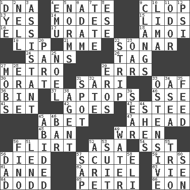 ACROSS 1. Heredity factor (abbr.) 4. Maternal 9. Hoof sound 13. It is so 14. Methods 15. Hats (slang) 16. Raised railways 17. A salt of uric acid 18. Mine, in Marseilles 19. Mouth edge 21. Madame (abbr.) 22. Underwater navigation system 24. Without 26. Label 27. Paris' subway 29. Blunders 30. Speak pompously 31. Indian skirt 33. Clumsy lout 36. Storage container 37. Portable computers 40. Compass dir. 41. Arrange properly for use 42. Moves 43. First name in cosmetics 45. Collude with 47. Having the leading position 48. Bar 49. Songbird 50. Talk or behave amorously 52. White ___ sheet 54. Fast jet (abbr.) 56. Passed on 57. Turtle shell scale 59. Big collection agency 61. Queen of England 1702-14 62. Satellite of Uranus 63. Compete 64. Texas town _ City 65. _ dish (used to culture cells) 66. A really long time DOWN 1. Color 2. 1994 drama film starring Jodie Foster 3. Aide 4. Australian flightless bird 5. Typical standards 6. First man 7. False hair 8. Compass dir. 9. Rings like a ship's bell 10. Pale green bean 11. Scent 12. Air pressure measure (abbr.) 20. Role in a play 22. Remove all contents or possession from 23. Boat paddle 25. Christmas carol 27. Disorderly crowds 28. 4th largest of the Great Lakes 29. Greek god of love 31. Blemish 32. Had dinner 33. Clearly or manifestly demonstrative 34. At sea 35. Nourish 38. Rep 39. Scorch 44. "______ My Girl" (Turtles hit) 45. Remained 46. Tavern 49. Wetness 50. A pale, very dry sherry 51. Grant temporary use of 52. Measure of real estate 53. Set of matching outer garments 55. Musical group of three 56. June honoree 57. Plant excrement 58. Connecticut Ivy Leaguer 60. Elected rep.