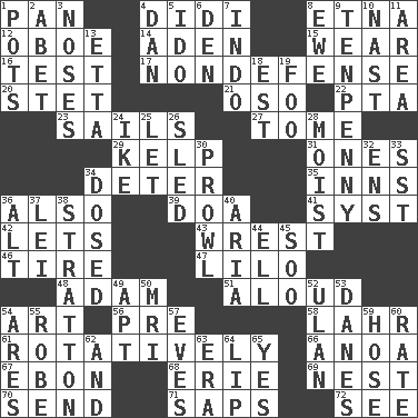 ACROSS 1. Baking dish 4. "You Light Up My Life" star Conn 8. Inactive volcano in Sicily 12. Mitch Miller's instrument 14. Arabian gulf 15. Put on (as clothing) 16. Trial 17. Unrelated to defense, as in spending 20. Proofreading order 21. Bear (Spanish) 22. Parent Teacher Association (abbr.) 23. Moves on water 27. Heavy book 29. Seaweed 31. Singles 34. Prevent from occurring 35. Restaurants 36. In addition 39. ___ good deed 41. System (abbr.) 42. Allows 43. Take or capture by force 46. Hoop that covers a wheel 47. _ and Stitch 48. First man 51. Verbally 54. Tate display 56. Before (prefix) 58. Cowardly lion portrayer 61. Happening in regular succession 66. Small Philippine buffalo 67. Inky black, to poets 68. 4th largest of the Great Lakes 69. A home for chicks 70. Post 71. Plant excrements 72. Observe DOWN 1. Cooking vessels 2. Collude with 3. Olfactory organs 4. One of the 12 tribes of Israel 5. Wedding promise 6. Lair 7. Southeast Asian peninsula 8. She-sheep 9. 3-inch nail 10. Political cartoonist Thomas 11. Type of rug 13. Singer James 18. Eastern Standard Time (abbr.) 19. Egg _ yung 24. Eisenhower's nickname 25. Allow 26. Downhill vehicle 28. Damp 30. Move like a hungry wolf 32. Followers of ems 33. Fast jet (abbr.) 34. Administered medicine 36. Keyboard modifier key 37. Luau accessory 38. Ski resort town in Vermont 40. Operatic vocal solo 44. Pipe bend 45. "Barney Miller" actor Jack 49. Fitting 50. Medical imaging device (abbr.) 52. ____ Bator, Mongolia 53. Natives or inhabitants of Denmark 54. Ancient Greek god of war 55. Loose flowing garment 57. Nights before holidays 59. Stockings 60. Assign a rank or rating to 62. Also 63. Period 64. Mouth edge 65. Consenting reply