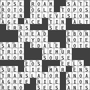 ACROSS 1. Domed church section 5. Wander 9. Suttee (variant) 13. Printing process, for short 14. Stare 15. Traditional theme or motif 16. Genesis locale 17. Boob tube 19. Grow older 20. Adept person 21. Metal container 22. The first octave above the treble staff 23. Blunders 25. Observe 26. At or in the front 30. Inky black, to poets 34. Miss Universe 1986, Barbara Palacios _ 35. Observe 36. Indian skirt 39. Peak District village in England 42. Carry 43. Musical group of three 44. Arboreal primate 46. A really long time 47. Lush 48. Greek goddess of the dawn 51. Snakelike fish 54. Take to court 57. Untruth 58. Make imperfect 60. Followers of ems 62. Interpreter 65. Small Philippine buffalo 66. Match 67. "Death on the ____" 68. The Jewish people; Israel 69. Western Nevada city 70. Observes 71. Pismires DOWN 1. Type of rug 2. Puddle 3. Guide 4. Period of immesurable duration 5. College mil. group 6. Double curve, resembling the letter S 7. Everything 8. Confronts 9. Mayday 10. Capital of Western Samoa 11. Utensil 12. Is not 15. Prong on a fork 18. Compete 20. American tennis player Robert 24. Food allowance for one day 27. Sight organ 28. Increase 29. Allots cards 30. Main course 31. Surprise greeting 32. Baseball player Mel 33. Born 36. R.R. building 37. "We ___ not amused" (Victoria) 38. _ de Janeiro 40. Lion 41. Australian flightless bird 45. One who uses or employs something 48. Otherwise 49. Lubricate 50. Seines 52. Soviet premier 1918-24 53. Snout, nose 54. Play the lead 55. Goad 56. Merit 58. Undercover agent 59. Ancient Greek god of war 61. Without 63. Modern: prefix 64. Make a knot 65. White ___ sheet