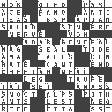 ACROSS 1. Disorderly crowd 4. Butter sub 8. Inconspicuous attention getter 12. Adept person 13. Papal veil 14. Against 15. Afternoon social gatherings 17. Cook's measure (abbr.) 18. Bee-related 19. First course 21. Elected rep. 23. Before (prefix) 24. Impudent aggressiveness 26. Solemn pledge 28. The sixth month of the Jewish calendar 30. Commissioned military rank 34. Tired old horse 37. Lick closed 39. Periodic rise and fall of the sea level 40. Wet nurse (var.) 41. Falsehoods 43. Lair 44. Assign a rank or rating to 46. Patter 47. Conclude 48. Leopard's kin 51. Actress Patricia 54. Part of a journey 55. Grayish beige 58. Make lace 61. Arrange properly for use 63. Collect or gather 65. Snob 67. High mountains 71. Heart or essence 72. Pismires 73. For fear that 74. Modern: prefix 75. Coral collection 76. Singer James 77. Fast jet (abbr.) DOWN 1. Floor coverings 2. Sea 3. Memphis, Tenn. Street 4. Often (poetically) 5. Experiment locale 6. Followers of ems 7. I made a mistake 8. Infant food 9. Clip 10. Play the lead 11. Prong on a fork 16. "Two Mules for Sister ____" 18. Soon (poet.) 20. Movie disc 22. Night before a holiday 25. Compass direction 27. Dripping 29. Arrive at 30. American astronaut and politician John 31. Travel on an animal 32. An important port of Yemen 33. Grant temporary use of 34. Drug cop 35. Housemaid 36. Yard entry 38. Chicken ___ king 42. Proofreading order 45. Snakelike fish 49. Trial 50. Grow older 52. American Automobile Association (abbr.) 53. Mass 56. Aches 57. _____ Park, CO 58. Russian ruler of old 59. Queen of England 1702-14 60. Carryall 62. Story 64. Attempt 66. Order of Saint Francis (abbr.) 68. Allow 69. Pacific Standard Time (abbr.) 70. R.R. building