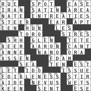 ACROSS 1. Sorrow 4. Blemish 8. Relaxation 12. SW Asia republic 14. Smooth fabric 16. Type of rug 17. Nathan's nickname 18. Pleas 20. Navigate 22. Ewer handle 23. Fitting 24. Car or cant ending 25. Attila the _ 28. French article 30. "Corrida" creature 31. Male parents of animals 35. Quiet! 37. Small, secluded valley 40. Wig 41. Fermented drink made from hops 42. Composer Copland 44. Patter 45. Queen of England 1702-14 46. Billionth: prefix 47. Mouth or opening 48. NE Netherlands city 50. Dutch treat 52. Ocean 54. Nine, plus one 55. Eastern Standard Time (abbr.) 58. Allow 61. Wedding promise 63. Come out of 65. The property of being fit to eat 70. Use a spoon 71. Helper 72. Mole, birthmark 73. Moistens 74. Peachy ____! 75. Posted 76. Compass dir. DOWN 1. Wash lightly 2. A salt of uric acid 3. Eroded 4. Compass dir. 5. Baking dish 6. Baseball player Mel 7. Become fatigued 8. Ingest 9. Roberta Peters solo 10. Ooze 11. 90 degrees 13. Born 15. Anneal 19. Ancient Greek god of war 21. 17th letter of the Greek alphabet 26. Capital and largest city of Mongolia 27. Pitcher Ryan 29. "Cheers" or "Ellen" 30. Trios 32. Located in or toward the back 33. Inactive volcano in Sicily 34. Arrange properly for use 35. Elected reps. 36. Coop moms 38. Period 39. Music written for nine 41. Sound made by sheep 43. Thickened enlargement 49. Famous astronaut Armstrong 51. Cuckoo 53. An important port of Yemen 55. First name in cosmetics 56. Sets of matching outer garments 57. Laconic 58. Path through which fluid escapes 59. Singer Brickell 60. Event that recurs at intervals 62. Singles 64. Compass dir. 66. Benjamin's nick name 67. Night before a holiday 68. Player for Phoenix 69. Fast jet (abbr.)