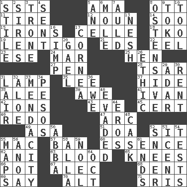 ACROSS 1. Fast planes 5. Nursemaid (var.) 8. Baseball player Mel 11. Become fatigued 12. Part of speech 14. "Barney Miller" actor Jack 15. Metal shackles 17. Cell (Danish) 18. Ring climax 19. Small, flat, pigmented spot on the skin 21. Begley and Asner 22. Snakelike fish 23. Compass dir. 24. Third mo. 25. Layer 27. Writing instrument 28. Russian ruler of old 31. Desk light 35. Area sheltered from the wind 37. Flintstone garb 38. Toward shelter 39. Deep reverence 41. "Terrible" tsar 42. Charged atoms 43. Night before a holiday 45. Certainty 46. Do over again 47. Curve 49. White ___ sheet 51. ___ good deed 52. Be seated 55. Apple computer (short form) 57. Bar 60. Substance 62. Black tropical American cuckoo 63. Vital fluid 65. Leg joints 66. Plant holder 67. Actor Baldwin 68. Undesirable depression on a surface 69. Declare 70. The first octave above the treble staff 71. Indian titles of respect DOWN 1. Vertical member of a panel or frame 2. Begets 3. Marketplace scale 4. Transmitted 5. One (Scot) 6. Undercover agent 7. Old (Scot.) 8. Clearly or manifestly demonstrative 9. Casino tip 10. Instrument 13. Tender 16. Simple or foolish person 17. Pupil covering 20. Highlander 26. Moral principle 29. The sixth month of the Jewish calendar 30. Monthly bill 31. Den 32. Medicinal plant 33. Ananias' fault 34. Mexican monetary units 36. She-sheep 40. Dodged 44. Greek god of love 48. Keg 50. Swedish rock group 52. Scornful expression 53. Ancient Celtic tribe of eastern Britain 54. Trials 55. Atlas contents 56. Small Philippine buffalo 58. Silent film actress Nazimova 59. Christmas carol 61. Extremities 64. Sep. follower