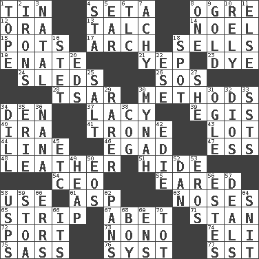 ACROSS 1. Shallow baking pan 4. Stalk of a moss capsule 8. Legendary monster 12. Mouth or opening 13. Baby powder 14. Christmas carol 15. Cooking vessels 17. Bowlike part 18. Exchanges for money 19. Related on the mother's side 21. Slangy assent 23. Color 24. Bobsleighs 26. Mayday 28. Russian ruler of old 30. Modes 34. Lair 37. Made of lace 39. Armor plate that protects the chest 40. Retirement account (abbr.) 41. Marketplace scale 43. Car dealer's back yard 44. Actor's bit 46. Mild oath 47. Double-curved letter 48. Cordwainer's material 51. Flintstone garb 54. Corporate head (abbr.) 55. Having ears or earlike features 58. Purpose 61. Viper 63. Olfactory organs 65. Long narrow piece of something 67. Collude with 71. Comedian Laurel of Laurel & Hardy 72. Left side of a ship or aircraft 73. Words to Nanette 74. Connecticut Ivy Leaguer 75. Backtalk 76. System (abbr.) 77. Fast jet (abbr.) DOWN 1. Drink excessively 2. Removes the wrinkles 3. Brizilian seaport 4. R.R. building 5. Ewer handle 6. Affectionate concern, for short 7. Painful 8. Single 9. Gilt 10. Depend 11. Otherwise 16. Proofreading order 18. Specific locale 20. Begley and Asner 22. Compass dir. 25. Table seasoning 27. A female animal or person 29. More valued for its uncommonness 30. Non-adult bird? 31. Stare at amorously 32. "Vaya con ____" 33. Fast planes 34. Deli pickle 35. One of the Great Lakes 36. Grandmother 38. Gear tooth 42. Singer Brickell 45. And so on (abbr.) 49. Pile 50. Greek goddess of the dawn 52. One of the 12 tribes of Israel 53. Greek god of love 56. _____ Park, CO 57. Allots cards 58. United States Postal Service (abbr.) 59. Portico 60. Blunders 62. Zero-star reviews 64. In a ____ (agitated or irritated) 66. ___ a Wonderful Life 68. Male child 69. Followers of ems 70. Small child