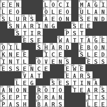ACROSS 1. Car or cant ending 4. Locales 8. Wise men 12. Lion 13. Margarine 14. ____ Bator 15. Disparaging remarks 18. Period of immesurable duration 19. Post 20. Catching in a trap 22. Observe 23. Tumult 24. Pacific Standard Time (abbr.) 25. Compass dir. 26. Electrical Measurement 30. Petroleum 33. Broken piece 36. Inky black, to poets 37. Leg joint 39. Frozen water 40. Downhill vehicle 41. International (abbr.) 42. Baking chambers 44. Double-curved letter 45. Substance 47. She-sheep 50. Large container 51. Hearing organs 53. Part of a journey 54. French poetic form 57. At once, immediately (arch.) 59. Printing process, for short 61. Separates forcefully 63. Back-to-school mo. 64. Northwest Algerian city 65. It is 66. Romantic infatuation 67. Long, evenly shaped pieces 68. Area sheltered from the wind DOWN 1. Raised railways 2. Snakelike fish 3. Parts of speech 4. Grant temporary use of 5. Cassini of fashion 6. Corporate head (abbr.) 7. Electrically charged atom 8. French bagpipes 9. Toward shelter 10. Separate the seeds from cotton 11. Indiana (abbr.) 16. Assign a rank or rating to 17. Indian titles of respect 21. Angers 22. Fast jet (abbr.) 24. Groovy apt. 26. Songbird 27. Competent 28. Moves 29. Extremities 30. Migrant worker of the '30s 31. Restaurants 32. Allows 34. Hub of activity 35. Adept person 38. Veterans Day date 42. Sep. follower 43. Observes 46. Tired old horse 48. Electrical Unit 49. One of the Great Lakes 52. Slow-paced one 53. Chops off 54. Play the lead 55. Immeasurably long periods of time 56. Johnson of "Laugh-In" 57. Viper 58. Teachers' org. 59. Director Reiner 60. Mouth or opening 62. Compass dir.