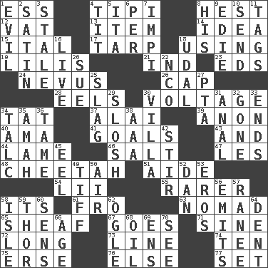 ACROSS 1. Curvy letter 4. Native american tent (variation) 8. Behest 12. Large container 13. A distinct part 14. It may be bright or harebrained 15. Slanted text style (abbr.) 17. Canvas cover 18. Exploiting 19. Ms. Damita and namesakes 21. Working for oneself (abbr.) 23. Begley and Asner 24. Mole, birthmark 26. Head covering 28. Snakelike fish 30. Electrical Measurement 34. Make lace 37. Jai _ 39. At once, immediately (arch.) 40. Housemaid (var.) 41. Finish lines 43. Also 44. Unable to walk 46. Table seasoning 47. French article 48. Leopard's kin 51. Assistant 54. Cards in a Roman deck? 55. More uncommon 58. It is 61. Back 63. Roamer 65. Archer's quiver 67. Leaves 71. Trig term 72. Protracted 73. Actor's bit 74. "___ Little Indians" 75. Celtic language 76. Otherwise 77. Arrange properly for use DOWN 1. Morally bad or wrong 2. Smooth fabric 3. Having lost freshness 4. Teat (slang) 5. Call ___ day 6. For each 7. Body of Kaffir warriors 8. Part of HMS, perhaps 9. Singer Brickell 10. Transmit 11. Labels 16. Moving, as bait 18. Hereditary estate 20. Take to court 22. Non-commissioned officer (abbr.) 25. Volcanic refuse 27. Parent Teacher Association (abbr.) 29. Splash clumsily 30. Country estate 31. Of or related to the anus 32. Went 33. Conclusions 34. Baby powder 35. Wet nurse 36. Not wild 38. Auto club (abbr.) 42. Disorderly outburst 45. Snakelike fish 49. Small quarrel 50. Atmosphere 52. One of the 12 tribes of Israel 53. Greek god of love 56. Gives off 57. Indian princess (variant) 58. Capri or Wight 59. Son of Odin 60. Elected reps. 62. Stare at amorously 64. Gouge 66. Personal question 68. Lubricate 69. Followers of ems 70. Perceive with the eye