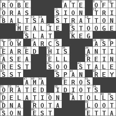 ACROSS 1. Loose flowing garment 5. Had dinner 8. Often (poetically) 11. Mouths or openings 12. The Jewish people; Israel 13. Three (prefix) 14. Greek mezzo-soprano Agnes 17. Ski resort town in Vermont 19. Ear of corn 21. Moe Howard, for one 22. Narrow board 23. Cask 24. Pull behind 27. Curves 29. Viper 32. Having ears or earlike features 34. Part of HMS, perhaps 36. Opposed to 37. At sea 38. Pipe bend 39. It's straight from the horse's mouth 40. Remainder 41. "Barney Miller" actor Jack 42. Having lost freshness 43. Fast jet (abbr.) 44. Connect, as a bridge 46. Marina Del _, California 47. Nanny (var.) 50. Greek god of love 52. Declaimed 55. Foolish or stupid persons 57. Accusation by an informer 59. Ringlike coral islands and reefs 62. Heredity factor (abbr.) 63. Round or rotation of duties 64. Spoils 65. Male child 66. Eastern Standard Time (abbr.) 67. Singer James DOWN 1. Director Reiner 2. Mouth or opening 3. Lip ointment 4. _____ Park, CO 5. Small island 6. Cod relative 7. Maternal 8. "Beetle Bailey" pooch 9. Tree-dwelling hopper 10. Prong on a fork 12. Compass dir. 15. Vegetable dish 16. Having or resembling wings 18. Coat; cloak 20. Strong, restless desires 24. Pulls apart 25. Fertile tracts in a desert 26. Obtain by seizing forcibly or violently 28. Grain storage towers 29. Approach 30. Vertical member of a panel or frame 31. Abounding in pines 33. Consume 35. Inclined 36. Tate display 42. Snout, nose 45. Operatic vocal solo 47. _ moment's notice (2 wds.) 48. Distance measurement (Brit.) 49. Goodbye (Sp.) 51. Took without asking 52. Likelihood 53. Western Nevada city 54. Actor Alda or Thicke 55. _ tizzy (2 wds.) 56. Slit 58. Baseball player Mel 60. Car dealer's back yard 61. R.R. building