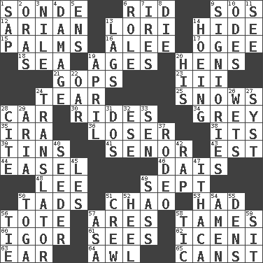 ACROSS 1. Something which is sent 6. To free from 9. Mayday 12. Believer in; advocate of (suffix) 13. Australian parrot (variant) 14. Flintstone garb 15. Insides of hands 16. Toward shelter 17. Double curve, resembling the letter S 18. Ocean 19. Grows older 20. Coop moms 21. Republicans 23. One more than two 24. Rend 25. Frozen precipitation (plural) 28. Automobile 30. Amusement-park features 34. Jennifer or Joel 35. Lyricist Gershwin 36. Failure 38. It is 39. Canisters 41. Sir (Sp.) 43. Eastern Standard Time (abbr.) 44. Artist's stand 46. Raised platform 48. Area sheltered from the wind 49. Back-to-school mo. 50. Bits 51. US Secretary of Labor Elaine L. _ 53. Possessed 56. Haul 57. Ancient Greek god of war 58. Corrects by punishment or discipline 60. Composer Stravinsky 61. Perceives with the eye 62. Ancient Celtic tribe of eastern Britain 63. Ewer handle 64. Leather borer 65. 2nd pers. sing. pres. of can (arch.) DOWN 1. Plant excrement 2. Mouths or openings 3. "Death on the ____" 4. Break 5. Followers of ems 6. Hero or heavy, e.g. 7. Angers 8. Expire 9. Seigniories (variant) 10. Lyric poems 11. Observe 13. Fails to keep up a pace 14. Cultivating 19. Showery time 20. Part of HMS, perhaps 22. Boat paddle 24. Interpreter 26. Soaks 27. System (abbr.) 28. Quote 29. Operatic vocal solo 31. Two (Sp.) 32. Compass dir. 33. Elected rep. 37. Cowboy competition 40. Sowing specialist 42. Hit sharply and swiftly 45. French article 47. New York city 49. Backtalk 50. Ancient Roman robe 51. Ship's personnel 52. The bottom of a shoe or boot 54. So be it 55. Lairs 56. Make a knot 57. White ___ sheet 58. Nervous spasm 59. Be seated