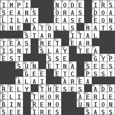 ACROSS 1. Body of Kaffir warriors 5. Thickened enlargement 9. Big collection agency 12. Actors Connery and Penn 14. Mouths or openings 15. ___ good deed 16. Pale purple color 17. Comfort 18. Period of immesurable duration 19. Compass dir. 20. Ringlike coral islands and reefs 23. Floor coverings 24. Play the lead 25. Slanted text style (abbr.) 27. Afternoon social gatherings 30. Was introduced to 32. Hearing organ 33. Is not 34. Kill 36. Beverage made from leaves 38. Eastern Standard Time (abbr.) 39. Compass dir. 40. Swindle 43. Player for Phoenix 46. Inactive volcano in Sicily 48. Observes 49. Turn to the right 51. And so on (abbr.) 52. Inconspicuous attention getter 53. Jai ____ 54. Length times width 56. Have trust in 58. College papers 61. Say or write further 64. Connecticut Ivy Leaguer 65. Son of Odin 66. Nest on high 68. Storage container 69. San ____ (Riviera town) 70. The state of being joined or united 71. Perceive with the eye 72. Angers 73. Backtalk DOWN 1. Capri or Wight 2. Chow _ 3. Diluted with white 4. _ tizzy (2 wds.) 5. Christmas carol 6. Relating to the mouth 7. Hyrax 8. Compass dir. 9. Perfect 10. Carrot, for example 11. Without 13. Go away! 21. Scottish caps 22. Threatening words 23. Female horse 24. Fast jet (abbr.) 26. Make lace 27. Neckwear 28. Curvy letter 29. Pismires 31. Clothes sense 35. Gossips 37. Eras 41. Consenting reply 42. Pacific Standard Time (abbr.) 44. Unsightly 45. Teachers' org. 47. Land measure 48. Health resort 50. One or the other 53. Place in a line 55. He sold his birthright 56. Confederate soldiers (slang) 57. Writer Wiesel 59. Residence 60. Greek god of love 61. Roberta Peters solo 62. "Vaya con ____" 63. Habitations of wild animals 65. Three (prefix) 67. Followers of ems