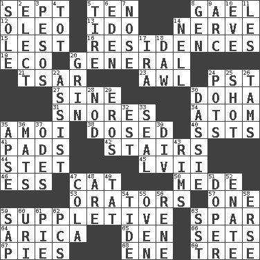 ACROSS 1. Back-to-school mo. 5. Nine, plus one 8. Highlander 12. Butter sub 13. Wedding promise 14. Boldness 15. For fear that 16. Dwellings 19. Environmental prefix 20. Commissioned military rank 21. Russian ruler of old 23. Leather borer 24. Pacific Standard Time (abbr.) 27. Trig term 30. Capital of the state of Qatar 31. Sounds asleep 34. Tiny particle 35. Mine, in Marseilles 38. Administered medicine 40. Fast planes 41. Groovy apts. 42. Flight of steps 44. Proofreading order 45. 57 in ancient Rome 46. Curvy letter 47. Feline 50. Ancient Persian 53. Speakers 57. Single 59. Supplementary 63. Coast Guard woman 64. N. Chile seaport 65. Lair 66. Arranges properly for use 67. Sliced desserts 68. Compass dir. 69. Family _ (genealogy) DOWN 1. Flatfish 2. Opt 3. Mexican monetary units 4. Small child 5. Hoop that covers a wheel 6. Paradise 7. Sense of smell 8. Commissioned military rank (abbr.) 9. Curve 10. Night before a holiday 11. French article 14. 1994 drama film starring Jodie Foster 17. Lyricist Gershwin 18. Obsolete 20. Smile widely 22. Help 24. Cooking vessels 25. Went for two points 26. Scottish caps 28. Dreamland 29. Greek god of love 30. Small ungulate mammals of Africa 32. Eastern Standard Time (abbr.) 33. Lick closed 35. Domed church section 36. Floor protectors 37. Lyric poems 39. HTML Container Element 43. Basketball hoops 47. Root beer relative 48. "We ___ not amused" (Victoria) 49. Make lace 51. Drug addict 52. Related on the mother's side 54. Periodic rise and fall of the sea level 55. Baking chamber 56. French philosopher Descartes 58. Celtic language 59. Plant excrement 60. RI univ. 61. Sliced dessert 62. Personal Computers (abbr.) 63. Fast jet (abbr.)
