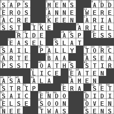 ACROSS 1. Plant excrements 5. Not women's 9. Increase 12. Greek god of love 13. Singer Murray 14. Past tense of be (plural) 15. Measure of real estate 16. Peachy ____! 17. Roberta Peters solo 18. Fast jet (abbr.) 19. D.D.E's nickname 21. Satellite of Uranus 22. Travel on an animal 24. Cleo's killer 26. Double-curved letter 27. Artist's stand 28. Narrow board 29. Move on water 30. Chummy 32. Torque (variant) 36. Johnson of "Laugh-In" 37. Sound made by sheep 38. Toward the sea 39. Inconspicuous attention getter 40. Expletives 42. Disorderly outburst 43. Louse (plural) 44. Consumed 46. White ___ sheet 49. Wing 50. So be it 51. Empty completely 53. Period 54. Arrange properly for use 57. Ketch in the Levant 58. Inside; within (prefix) 61. "You Light Up My Life" star Conn 62. Otherwise 63. Within a short period 64. Baking chamber 65. Born 66. It was, poetically 67. Elected reps. DOWN 1. Oceans 2. Arches 3. Likenesses of persons 4. Compass dir. 5. Cause to be 6. Compass dir. 7. Compass dir. 8. Elected rep. 9. Nest on high 10. Frees from moisture 11. Allots cards 14. Armed conflict 19. Binary compound 20. Seaweed 21. Fitting 23. Small island 24. Assad's deity 25. Declare 27. Hearing organs 28. Schedule 29. Plant excrement 31. Phillipine bananalike plant 32. Clothes sense 33. Clearly or manifestly demonstrative 34. It's straight from the horse's mouth 35. Automobile 40. Lubricate 41. Wither 43. Pet locale 45. Housemaid (var.) 46. NE Netherlands city 47. Having lost freshness 48. Get up 52. Frozen water 53. Immeasurably long periods of time 55. Genesis locale 56. Metal containers 58. Eastern Standard Time (abbr.) 59. At this time 60. ___ good deed 61. Two (Sp.)