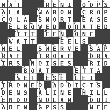 ACROSS 1. Floor covering 4. Painter Guido (1575-1642) 8. I made a mistake 12. Wing 13. Make _____ (do battle with) 14. Riding implement 15. Root beer relative 17. Derisive sound 18. Comfort 19. Turned at an angle; bent 21. Spoke pompously 23. Teat (slang) 24. Car or cant ending 26. Single 27. Electrical Unit 28. Snakelike fish 30. Cartoonist voice _ Blanc 31. Turn aside suddenly 34. Plant excrement 37. Actress Charlotte 38. Collection of objects 39. Mouth or opening 40. Big collection agency 41. Annoying sounds 42. To free from 43. Water vessel 44. Singer James 46. Put into a specified state 47. Compass dir. 50. Luau accessory 51. Pressed 54. Inveterate users 57. Cub Scout units 58. Place in a line 60. Land elevation 62. Inside; within (prefix) 63. Pitcher Ryan 64. Fr. "Yes" 65. Arabian gulf 66. Global Positioning Systems (abbr.) 67. Born DOWN 1. Big _ 2. Medicinal plant 3. Baron Munchausen's specialties 4. Indian princess (variant) 5. Wear away 6. And not 7. To the inside or interior of 8. Seas 9. Speak pompously 10. Airs 11. Broke a traffic law 13. Compass dir. 16. "This won't hurt ____!" 20. Baseball player Mel 22. Hero or heavy, e.g. 25. Effrontery 27. Erode 29. Nights before holidays 30. Medical imaging device (abbr.) 31. Portico 32. Compose 33. Greek goddess of the dawn 34. Drawing lots 35. Operatic vocal solo 36. Groovy apt. 41. Make mention of 43. Gillaume's butler role 44. Connecticut Ivy Leaguer 45. Technology 46. Something which is sent 48. Moves on water 49. Ferber et al. 51. The main thing one is thinking about 52. Tear apart 53. Mild oath, euphamism for damn 55. Lair 56. Change direction abruptly 59. Trim (branches) 61. Untruth