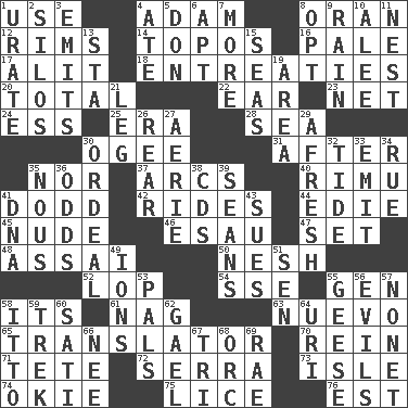 ACROSS 1. Purpose 4. First of billions? 8. Northwest Algerian city 12. Basketball hoops 14. Traditional theme or motif 16. Light colored 17. Came down and settled, as after flight 18. Pleas 20. "_____ Recall" 22. Hearing organ 23. Remaining after all deductions 24. Double-curved letter 25. Period 28. Ocean 30. Double curve, resembling the letter S 31. Following 35. Not either 37. Curves 40. Tall New Zealand timber tree 41. Texas town _ City 42. Amusement-park features 44. Singer Brickell 45. Unadorned 46. He sold his birthright 47. Put into a specified state 48. Slender Brazilian palm 50. Soft 52. Trim (branches) 54. Compass dir. 55. Commissioned military rank (abbr.) 58. ___ a Wonderful Life 61. Tired old horse 63. New (sp.) 65. Interpreter 70. It's straight from the horse's mouth 71. False hair 72. Spanish missionary in California 73. Capri or Wight 74. Migrant worker of the '30s 75. Louse (plural) 76. Eastern Standard Time (abbr.) DOWN 1. A salt of uric acid 2. Grain storage towers 3. Gives off 4. Had dinner 5. Spanish title 6. Fitting 7. Greater amount 8. Choose 9. Water falling in drops from the sky 10. Toward shelter 11. A home for chicks 13. R.R. building 15. Oceans 19. Length times width 21. Part of a journey 26. Bring up, as a child 27. Nest on high 29. Anew 30. Severe or trying experience 32. Periodic rise and fall of the sea level 33. Send forth 34. Regret 35. Good sense 36. Likelihood 38. Music discs 39. Seines 41. Heredity factor (abbr.) 43. Institutes legal proceedings 49. Charged atoms 51. Elected rep. 53. Friends 55. Honkers 56. Vices 57. Music written for nine 58. "Tell ____ the Marines!" 59. Long journey 60. Suttee (variant) 62. Highlander 64. RI univ. 66. Born 67. Three (prefix) 68. The grampus (Milton) 69. Actress Charlotte