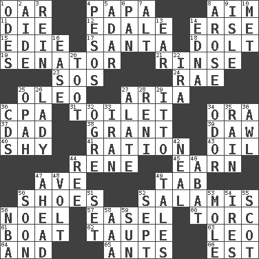 ACROSS 1. Boat paddle 4. Dad 8. Direct toward a target or goal 11. Pass on 12. Peak District village in England 14. Celtic language 15. Singer Brickell 17. Before Barbara or Clara 18. Stupid person 19. Legislator 21. Remove soap 23. Distress signal 24. Actress Charlotte 25. Butter sub 27. Roberta Peters solo 30. Tax preparer (abbr.) 31. Bathroom 34. Mouth or opening 37. June honoree 38. Monetary aid 39. Simpleton 40. Like a shrinking violet 41. Food allowance for one day 43. Lubricate 44. French philosopher Descartes 45. Merit 47. "___ Maria" 49. Bar bill 50. Imelda's hoard 52. Deli grouping 56. Christmas carol 57. Artist's stand 60. Torque (variant) 61. Water vessel 62. Grayish beige 63. Lion 64. Plus 65. Pismires 66. Eastern Standard Time (abbr.) DOWN 1. Lyric poems 2. Assistant 3. It's straight from the horse's mouth 4. Mexican monetary units 5. The sixth month of the Jewish calendar 6. Baking dish 7. Keyboard modifier key 8. Came up 9. Small island 10. Was introduced to 13. Ewer handle 14. Pulitzer Prize-winning author Ferber 16. Comfort 20. A blast of a horn 22. Retirement account (abbr.) 25. Brightly colored fish 26. Kenny Rogers chart-topper in '80 27. Having winglike extensions 28. Painter Guido (1575-1642) 29. "Tell ____ the Marines!" 30. Music discs 32. Legendary monster 33. SW Asia republic 34. Scent 35. Water falling in drops from the sky 36. Leather borer 42. Be tempered by heat 44. To sift 46. Blind as ____ 47. Having the leading position 48. Electrical Unit 49. Falsehoods 50. Within a short period 51. Arrange properly for use 52. Back-to-school mo. 53. Undercover agent 54. Angers 55. Highlander 56. Basketball assoc. 58. Auto club (abbr.) 59. Player for Phoenix