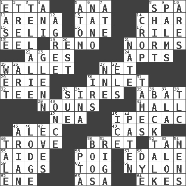 ACROSS 1. Singer James 5. Santa ___, CA 8. Health resort 11. Sports stadium 13. Make lace 14. Burn to charcoal 15. Major League Baseball Commissioner Bud 16. Single 17. Cause heat under the collar 18. Snakelike fish 19. San ____ (Riviera town) 21. Typical models 22. Eras 24. Tenement units (abbr.) 25. Place for singles 27. Fish or hair follower 29. One of the Great Lakes 30. An arm off of a larger body of water 32. Adolescent 33. Male parents of animals 35. Blind as ____ 39. Parts of speech 41. Shopping center 42. Teachers' org. 43. Medicinal drug used to evoke vomiting 45. Actor Baldwin 48. Keg 49. Collection of objects 50. Cy Young winner Saberhagen 52. Scottish cap 55. Assistant 56. Luau course 57. Peak District village in England 59. Fails to keep up a pace 60. Coat; cloak 61. Thermoplastic polyamide 62. Compass dir. 63. White ___ sheet 64. Supplements with great effort DOWN 1. Comfort 2. Woody plant 3. Copy Pinocchio 4. Cuckoo 5. Tiny particle 6. Billionth: prefix 7. Had dinner 8. Chest covering 9. Insides of hands 10. Ancient Greek god of war 12. Match 14. Riding implement 20. Eastern Standard Time (abbr.) 21. Nathan's nickname 23. American astronaut and politician John 25. Dripping 26. "We ___ not amused" (Victoria) 27. Compass dir. 28. Raised railways 30. Big collection agency 31. Softens 33. Institute legal proceedings 34. _ tizzy (2 wds.) 36. Sass 37. Insect wing 38. Affectionate concern, for short 40. Single time 43. Frozen water 44. Eucharist need 45. Believer in; advocate of (suffix) 46. Inn 47. Nights before holidays 49. Story 50. Scornful sounds 51. Capital of Latvia 53. _ vera 54. Not women's 56. Parent Teacher Association (abbr.) 58. Color