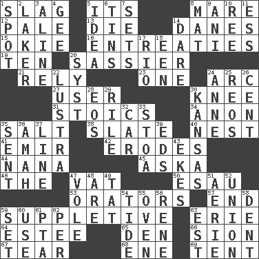 ACROSS 1. Volcanic refuse 5. ___ a Wonderful Life 8. Female horse 12. Light colored 13. Expire 14. Natives or inhabitants of Denmark 15. Migrant worker of the '30s 16. Pleas 19. "___ Little Indians" 20. More disrespectful 21. Have confidence or faith in 23. Single 24. Curve 27. One who makes use of a thing 30. Leg joint 31. Unemotional ones 34. Soon (poet.) 35. Table seasoning 38. Schedule 40. Egg locale 41. Independent ruler or chieftain 42. Eats (away) 44. Grandmother 45. "____ silly question..." 46. Definite Article 47. Large container 50. Son of Isaac 53. Speakers 57. Conclusion 59. Supplementary 63. One of the Great Lakes 64. First name in cosmetics 65. Lair 66. The Jewish people; Israel 67. Rend 68. Compass dir. 69. Portable shelter DOWN 1. Blemish 2. Member of a famous L.A. basketball team 3. Place in a line 4. Unit of force equal to gravity 5. The main thing one is thinking about 6. Canisters 7. Arranges properly for use 8. Floor protector 9. Black tropical American cuckoo 10. To sift 11. Curvy letter 14. Have the gumption 17. River (Sp.) 18. Car or cant ending 20. System (abbr.) 22. A period of five years 24. Singer Murray 25. Vintage cars 26. Penny 28. Greek goddess of the dawn 29. Cause heat under the collar 30. Sunflower state 32. Auto 33. Portico 35. Emitted 36. Wet nurse 37. Actor's bit 39. Begley and Asner 43. Makes supply last 47. Short-tailed, large-bodied rat 48. "We ___ not amused" (Victoria) 49. Make lace 51. Nest on high 52. The state of being joined or united 54. Event that recurs at intervals 55. Baking chamber 56. French philosopher Descartes 58. Gouge 59. Put into a specified state 60. Purpose 61. Parent Teacher Association (abbr.) 62. For each 63. Eastern Standard Time (abbr.)