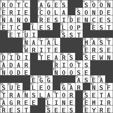 ACROSS 1. College mil. group 5. Grows older 9. Within a short period 13. One of the Great Lakes 14. Root beer relative 15. Message 16. Billionth: prefix 17. Dwellings 19. And so on (abbr.) 20. French article 21. Chop off 22. Eastern Standard Time (abbr.) 23. Needle case 25. Fast jet (abbr.) 26. Brizilian seaport 30. Vertical spar for supporting sails 34. Compose 35. Celtic language 36. "You Light Up My Life" star Conn 39. Separates forcefully 42. Stitched 43. The sixth month of the Jewish calendar 44. Disturbances 46. Thickened enlargement 47. Trap for birds or small mammals 48. Oval reproductive body of a fowl 51. Toward the sea 54. Institute legal proceedings 57. Lion 58. Slender fish 60. Science/research agcy. 62. Interpreter 65. Stalk of a moss capsule 66. Match 67. Actor's bit 68. Arab leader 69. Relief 70. Perceives with the eye 71. Jane of fiction DOWN 1. French philosopher Descartes 2. Declaim 3. Colored lightly or faintly 4. Corporate head (abbr.) 5. 43,560 square feet 6. Travels 7. Raised railways 8. Moves on water 9. Boy, to dad 10. At one time in the past 11. Lyric poems 12. A home for chicks 15. Back-to-school mo. 18. Two (Sp.) 20. One who doesn't tell the truth 24. Undo the wiring of 27. Teat (slang) 28. Had dinner 29. Memorize 30. Makes clutter 31. "We ___ not amused" (Victoria) 32. Compass dir. 33. "___ Little Indians" 36. Daniel's nick name 37. Wedding promise 38. Male parent 40. River (Sp.) 41. "Barney Miller" actor Jack 45. Russian ruler of old 48. Otherwise 49. Set 50. Purposes of endeavors 52. Foe 53. Having gotten out of bed 54. Play the lead 55. Goad 56. Hearing organs 58. Went 59. Ancient Greek god of war 61. Conductor's collection 63. Remaining after all deductions 64. Standoff 65. Observe