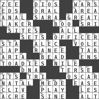 ACROSS 1. Last letter of the English alphabet 4. "Vaya con ____" 8. Armed conflicts 12. Begley and Asner 13. Taken by mouth 14. Length times width 15. Of or related to the anus 17. "Two Mules for Sister ____" 18. Relatively large 19. Member of a famous L.A. basketball team 21. Sometimes accompanies a hiss 23. _ Lanka 24. Locates 26. Everything 28. Puts into a specified state 30. Person of authority 34. R.R. building 37. Actor Baldwin 39. Short-tailed, large-bodied rat 40. Infant locale 41. Indian princess (variant) 43. Bar bill 44. Operatic vocal solo 46. Necklace unit 47. Followers of ems 48. Sycophants 51. Mediterranean tributary 54. Heredity factor (abbr.) 55. Laconic 58. It is 61. Three (prefix) 63. Witty Wilde 65. Brizilian seaport 67. Ancient Persian 71. Relaxation 72. 154 in Roman numerals 73. Frolic 74. French article 75. 43,560 square feet 76. Trig term 77. The first octave above the treble staff DOWN 1. Ardor 2. Ferber et al. 3. 1973 Nobel Price Winner (Physics) Leo 4. Two (Sp.) 5. Retirement account (abbr.) 6. Boat paddle 7. Thick slice 8. Armed conflict 9. Ancient Greek god of war 10. Stern 11. Suttee (variant) 16. Allows 18. Eighteen holes 20. To sift 22. Clumsy lout 25. Play the lead 27. 54 in ancient Rome 29. Thick slices 30. Sea 31. ____ d'Azur (French Riviera) 32. Style 33. Confederate soldiers (slang) 34. Narrow board 35. Edible starchy tuberous root 36. Capital of Western Samoa 38. Compass dir. 42. Prepare for publication 45. Say or write further 49. International (abbr.) 50. Hearing organ 52. Lion 53. Celtic language 56. Any of the three canals of the cochlea 57. Artist's stand 58. South American Indian 59. Baby powder 60. Use a spoon 62. Naughty children 64. Relief 66. "___ Maria" 68. Connecticut Ivy Leaguer 69. Daniel's nick name 70. Sight organ