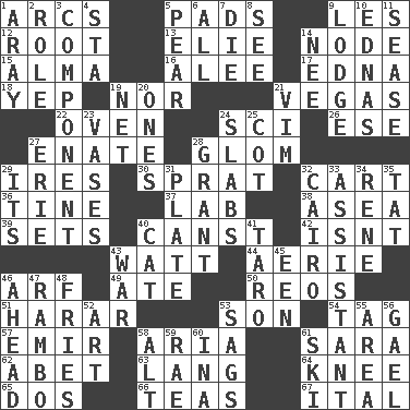 ACROSS 1. Curves 5. Writing tablets 9. French article 12. Carrot, for example 13. Writer Wiesel 14. Thickened enlargement 15. _ mater 16. Toward shelter 17. Pulitzer Prize-winning author Ferber 18. Slangy assent 19. And not 21. Viva Las _ 22. Baking chamber 24. _-fi 26. Compass dir. 27. Related on the mother's side 28. Take by theft 29. Angers 30. Small fatty European fish 32. Haul 36. Prong on a fork 37. Experiment locale 38. Toward the sea 39. Puts into a specified state 40. 2nd pers. sing. pres. of can (arch.) 42. Is not 43. Electrical Unit 44. Nest on high 46. Sandy's bark 49. Had dinner 50. Vintage cars 51. Ethiopian city, capital of Harari 53. Male offspring 54. Label 57. Arab leader 58. Operatic vocal solo 61. "Two Mules for Sister ____" 62. Collude with 63. Long (Scottish) 64. Leg joint 65. Two (Sp.) 66. Afternoon social gatherings 67. Slanted text style (abbr.) DOWN 1. Like ___ of sunshine 2. Hero or heavy, e.g. 3. Part 4. R.R. building 5. Lightbulb-shaped fruit 6. 100% 7. Expire 8. Perceive with the eye 9. Inn 10. Ferber et al. 11. Gospel singer Marvin 14. Born 19. Fish or hair follower 20. Singles 21. Zeal 23. Flower holders 24. Broad, flat, thick pieces 25. Small bed 27. 4th largest of the Great Lakes 28. Monetary aid 29. ___ a Wonderful Life 31. Food holder 32. Capital of Egypt 33. Aide 34. French philosopher Descartes 35. Make lace 40. Feline 41. Edible starchy tuberous root 43. Armed conflict 45. Car or cant ending 46. Having the leading position 47. Role for Stallone 48. Strips of potato fried in deep fat 52. Tate display 53. Droops 55. Length times width 56. Highlander 58. The first octave above the treble staff 59. Actress Charlotte 60. _ tizzy (2 wds.) 61. What Jean-Claude Killy likes to do